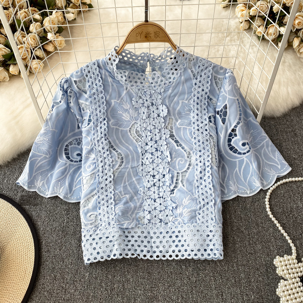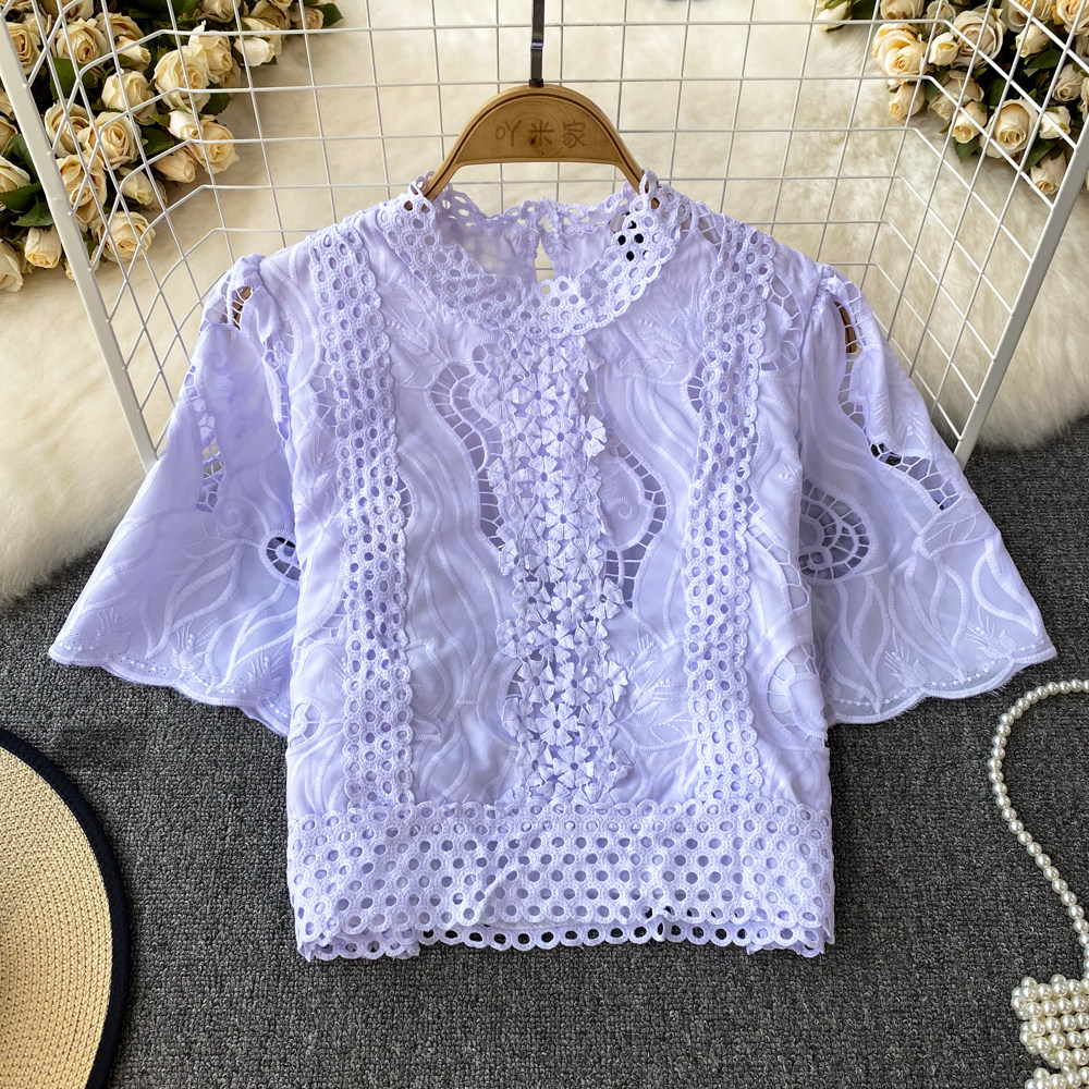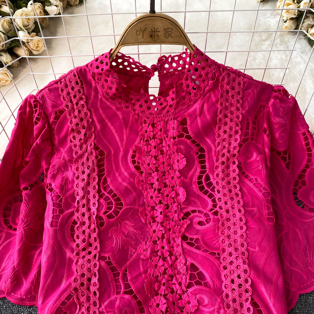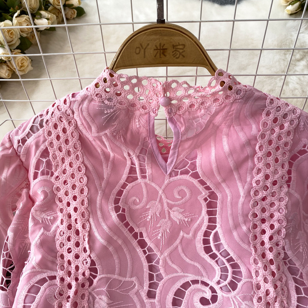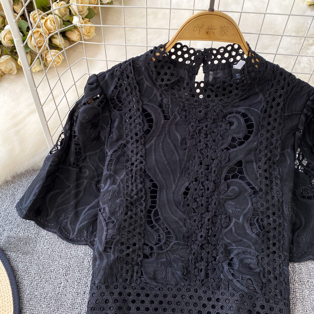 Французская ретро-ретро-темперамент автономный воротник полой крючок кружевную рубашку, чтобы вы выглядели тонкими и высокими талией короткие повседневные и универсальные топы