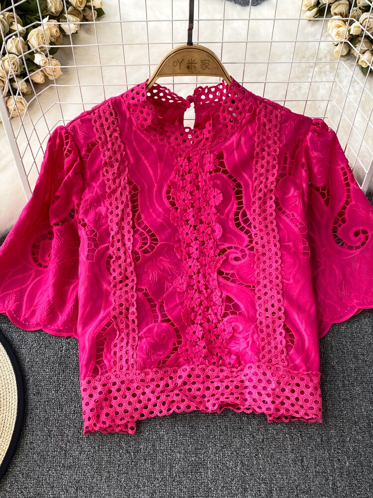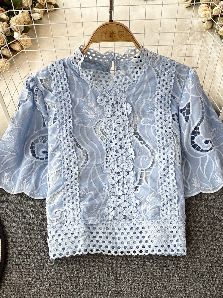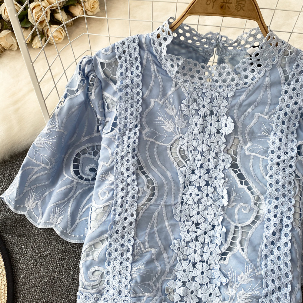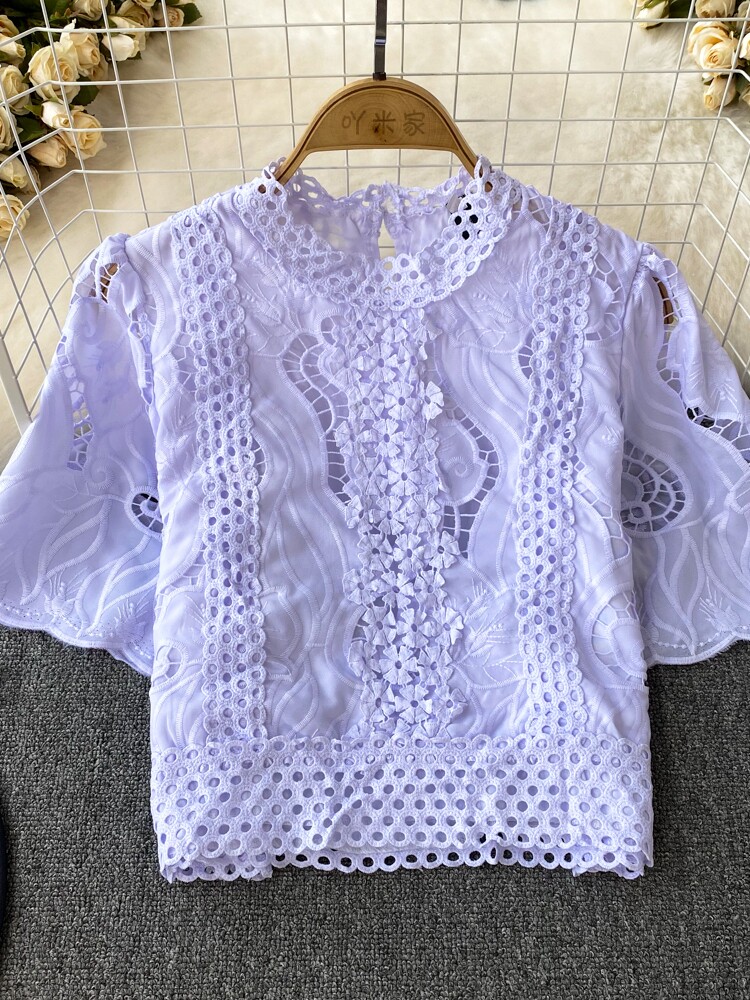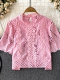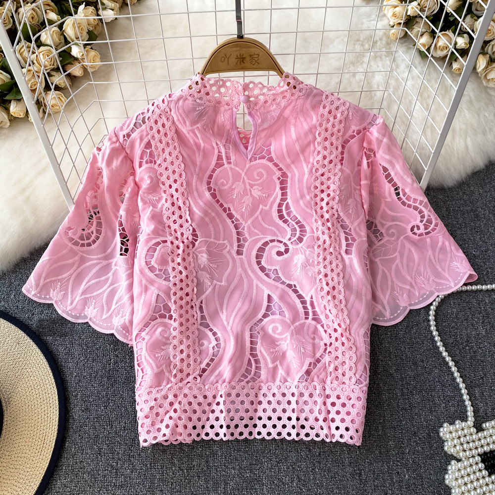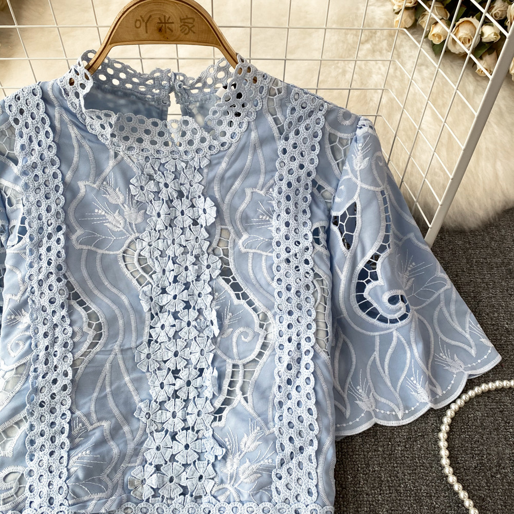 Французская ретро-ретро-темперамент автономный воротник полой крючок кружевную рубашку, чтобы вы выглядели тонкими и высокими талией короткие повседневные и универсальные топы