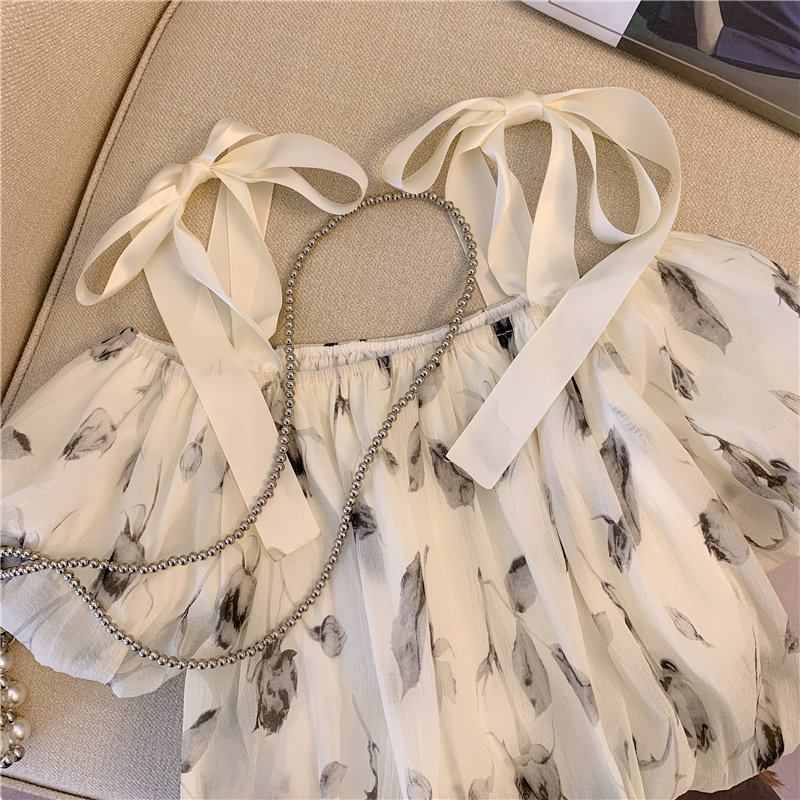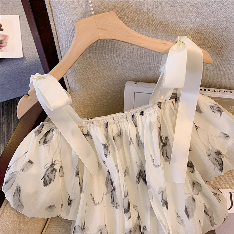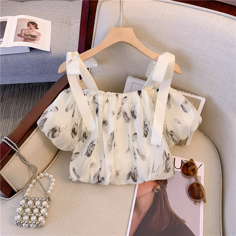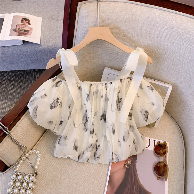 Летняя милая рубашка, открытые плечи, эффект подтяжки, в западном стиле, рукава фонарики, цветочный принт