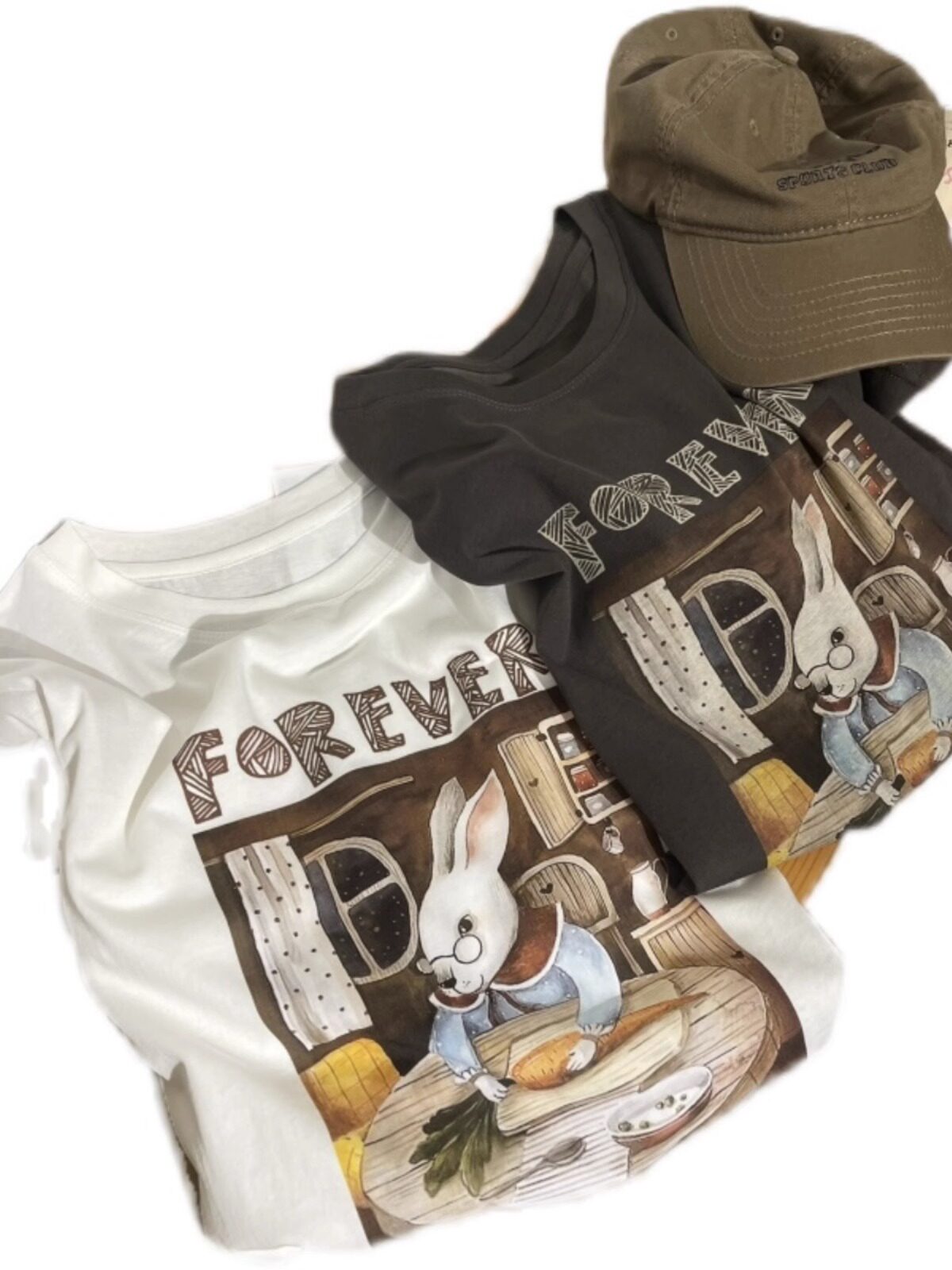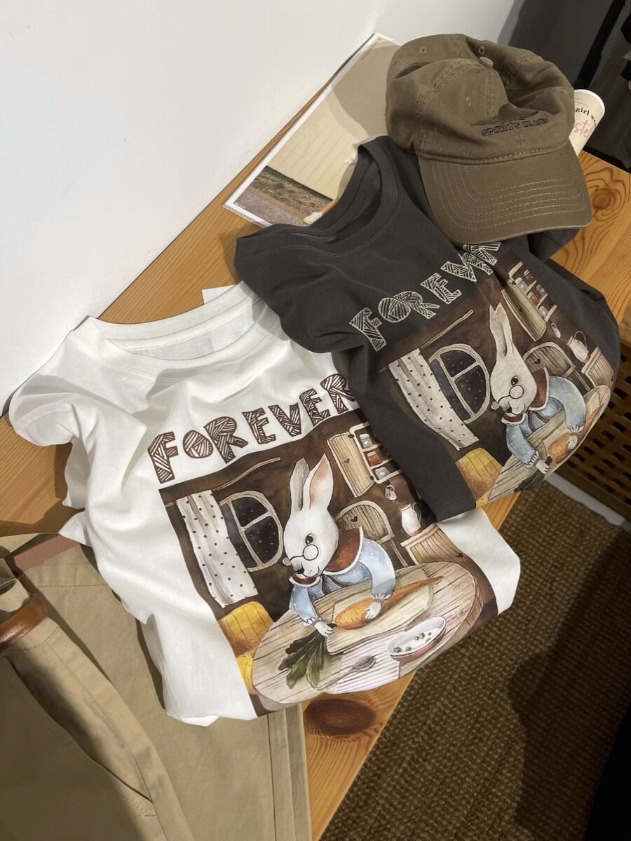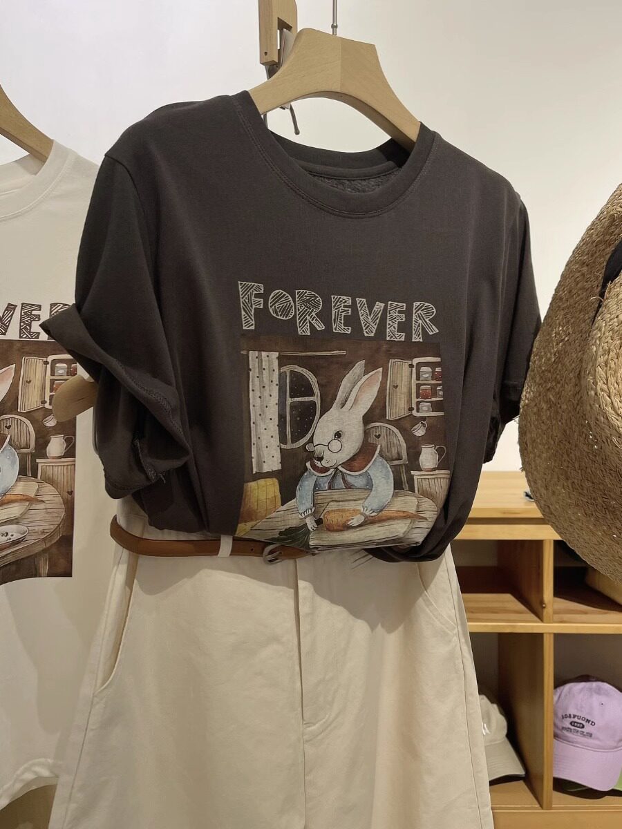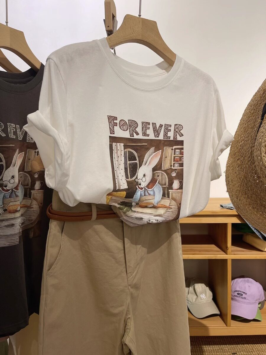 Ретро кролик, летняя хлопковая футболка для школьников и студентов, свободный крой