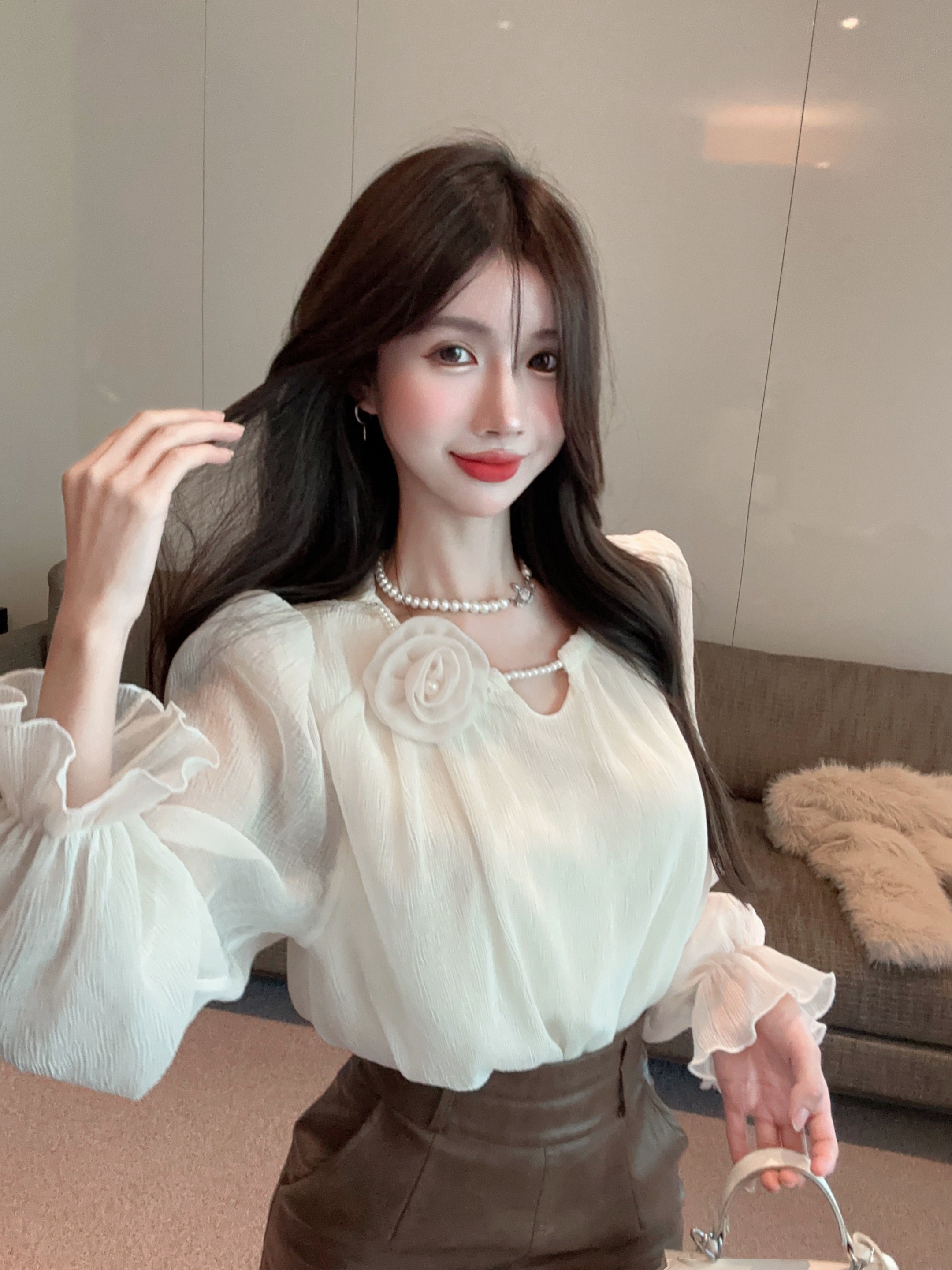 Мегафон, демисезонная кружевная шелковая приятная телу рубашка, в стиле Шанель, рукава фонарики, французский стиль