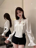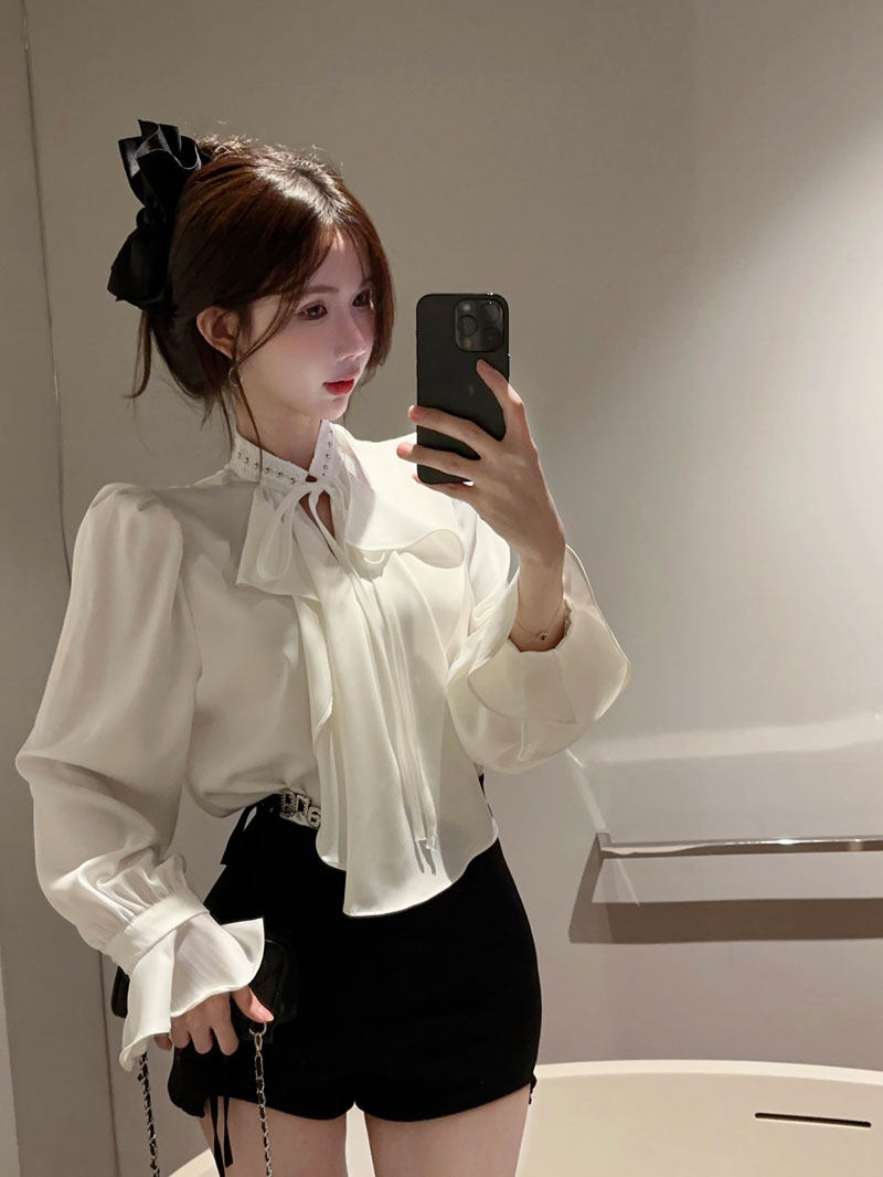 Демисезонная рубашка, базовый приятный телу мегафон, в стиле Шанель, рукава фонарики, французский стиль, высокий воротник