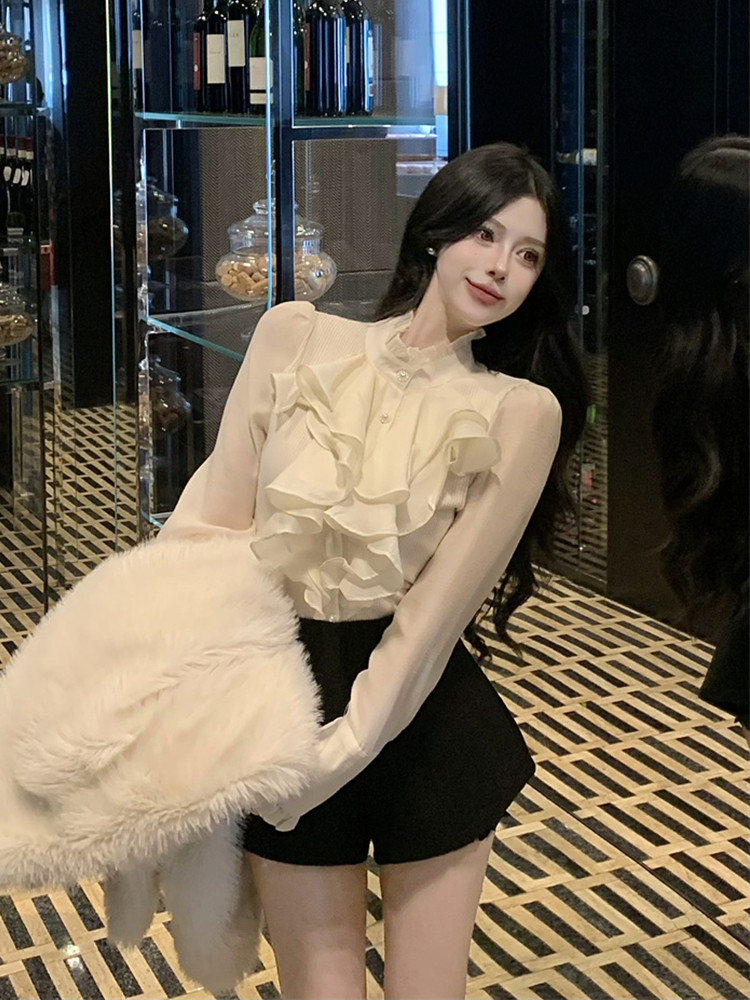 Демисезонная рубашка, кружевная шелковая приятная телу футболка, в стиле Шанель, рукава фонарики, высокий воротник