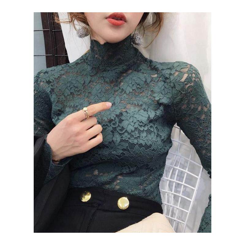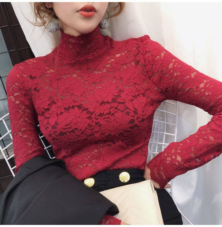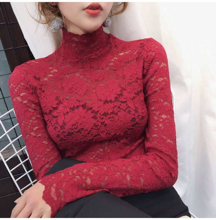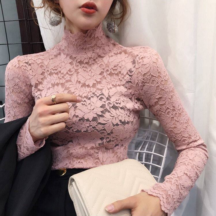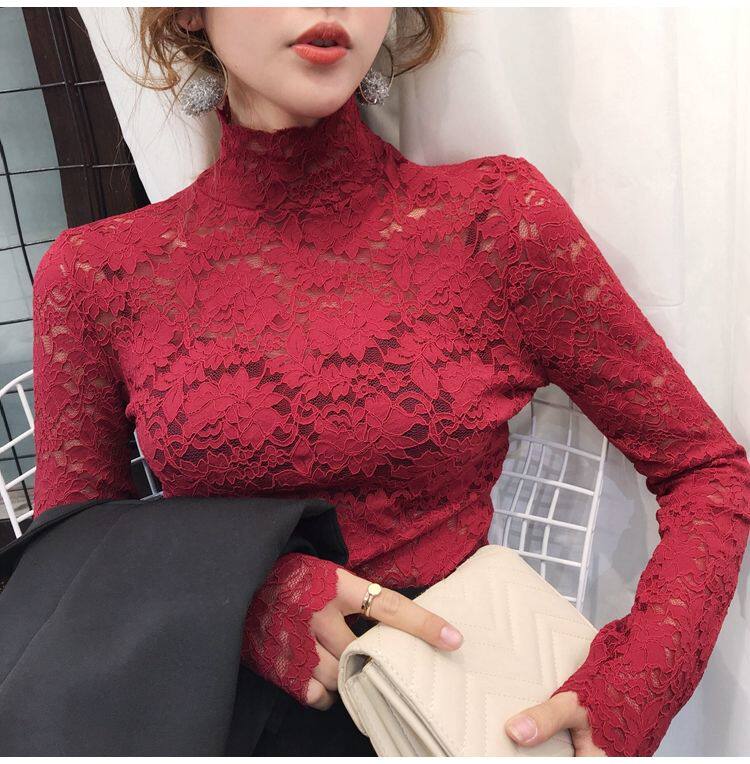 Цветной кружевной базовый приятный телу трендовый лонгслив, высокий воротник, в обтяжку