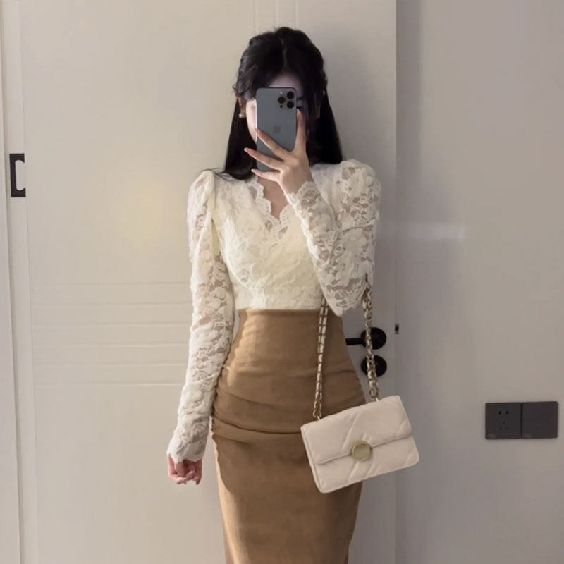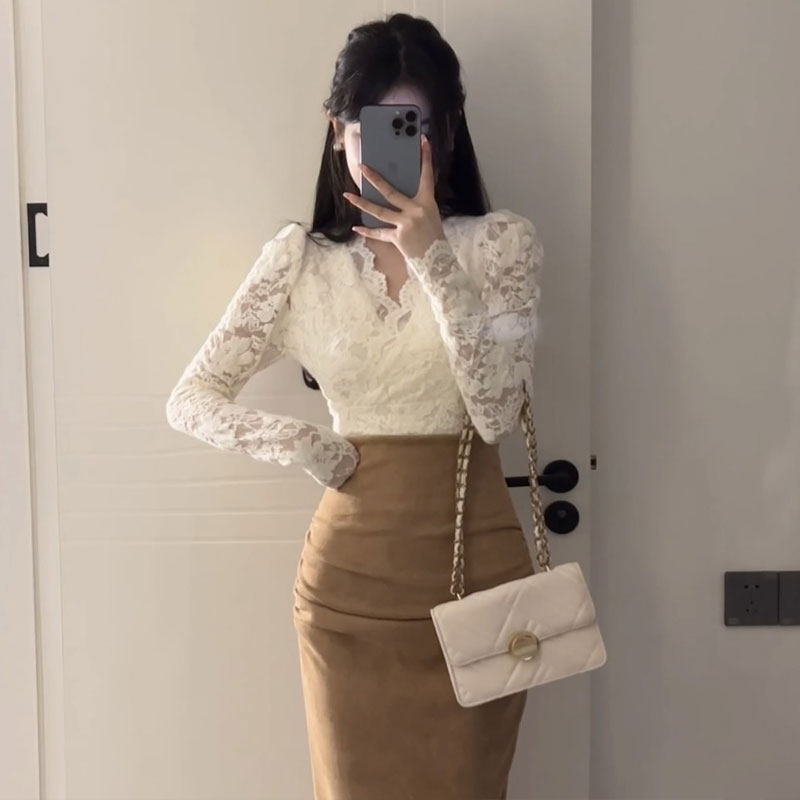 Женская рубашка с v-образным вырезом и бархатным кружевом в стиле французского темперамента, осень-зима 2023, новый стиль, шикарный и красивый внутренний топ
