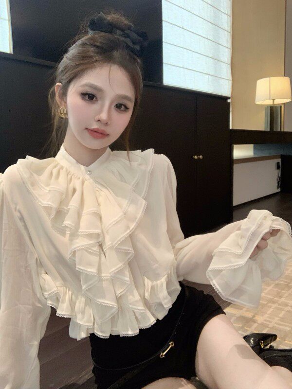 Демисезонная рубашка, мегафон, кружевная шелковая приятная телу футболка, в стиле Шанель, рукава фонарики