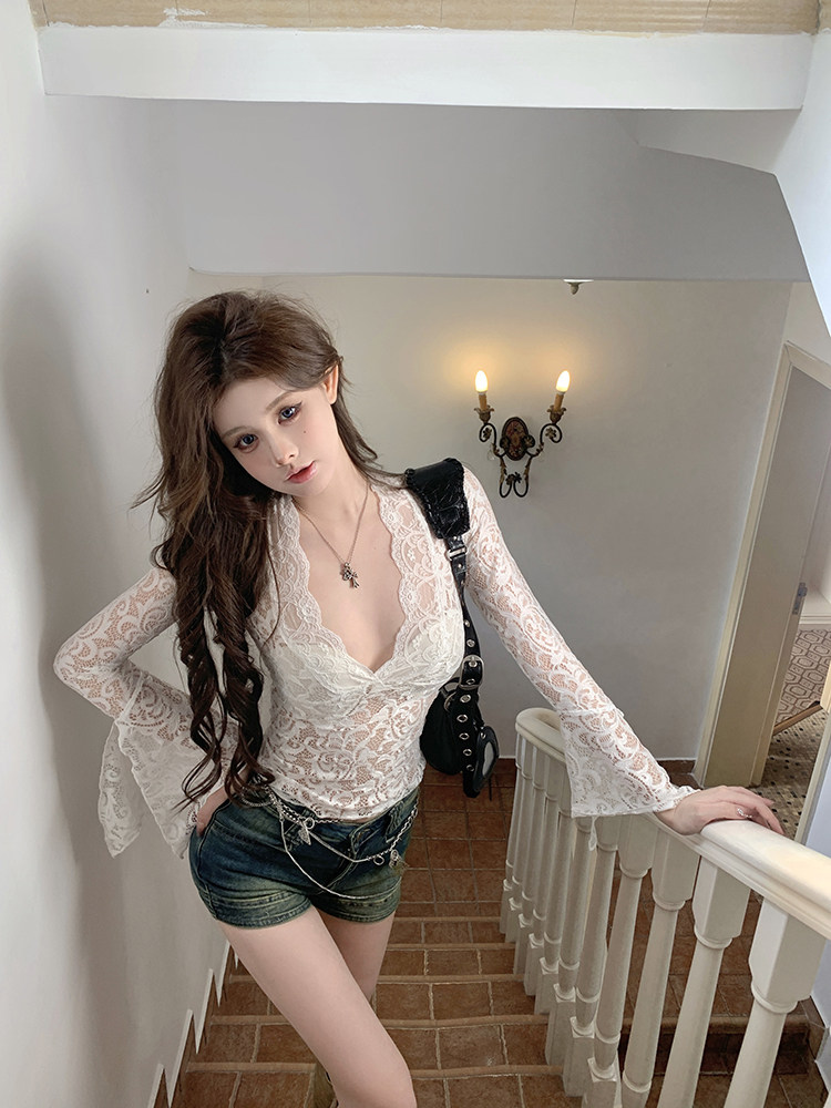 Белый кружевной осенний сексуальный короткий базовый приятный телу лонгслив, V-образный вырез