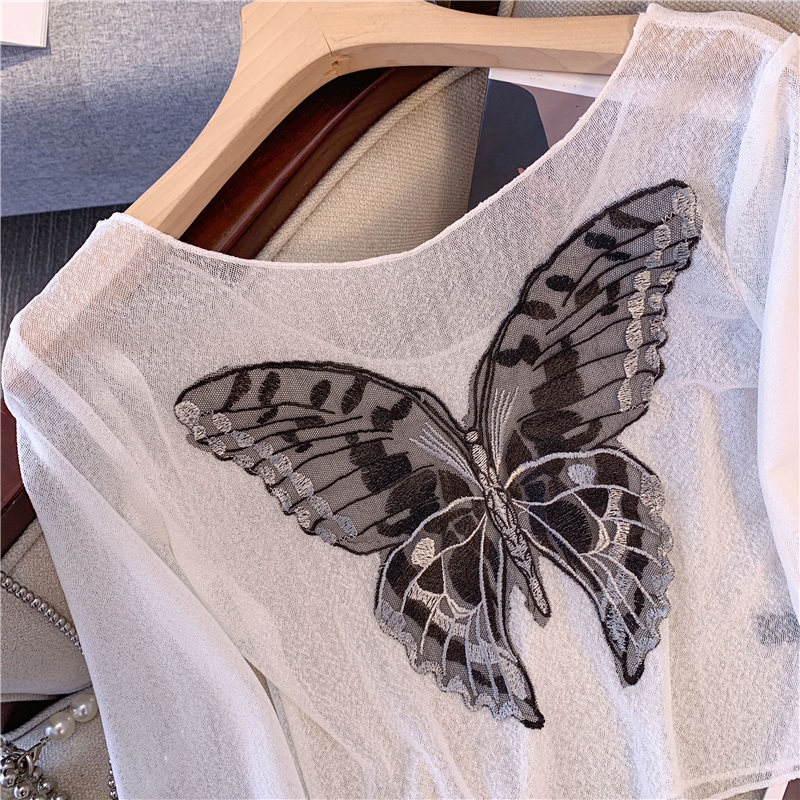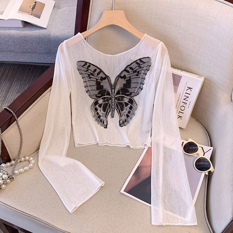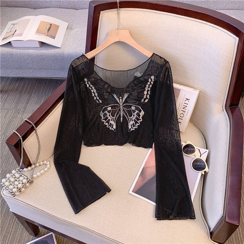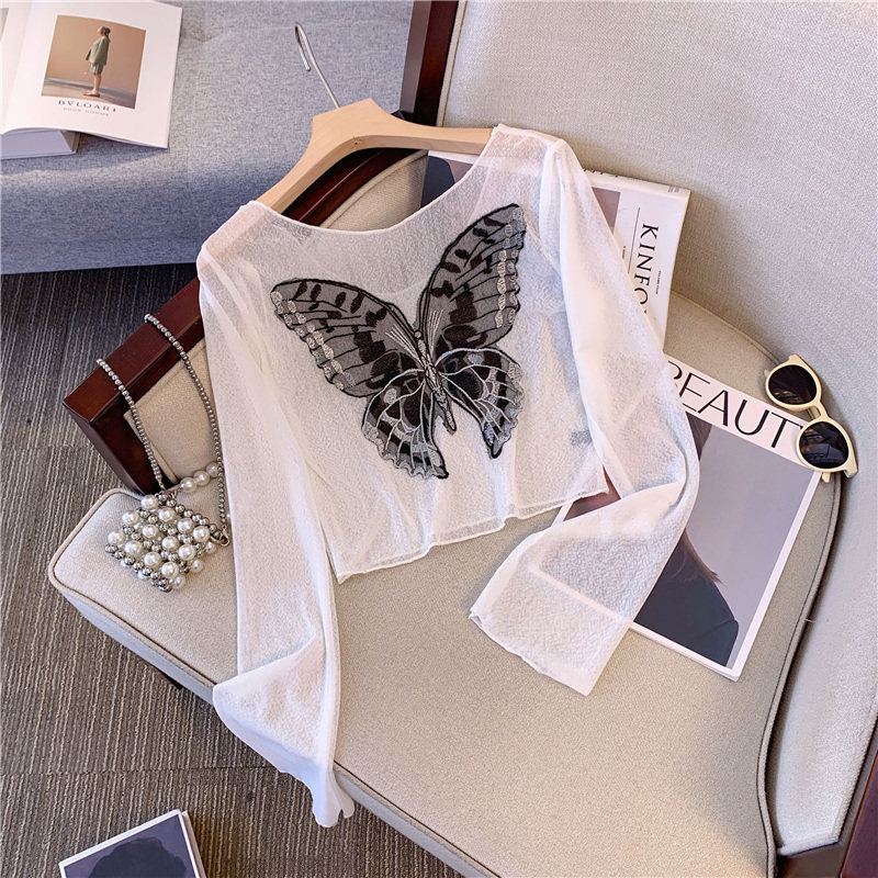 Дизайнерская летняя одежда для защиты от солнца с бантиком, короткий лонгслив, тренд сезона, с вышивкой, облегающий крой, V-образный вырез