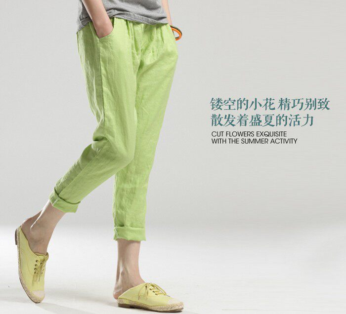 Свежие модные летние тонкие зеленые штаны, из хлопка и льна