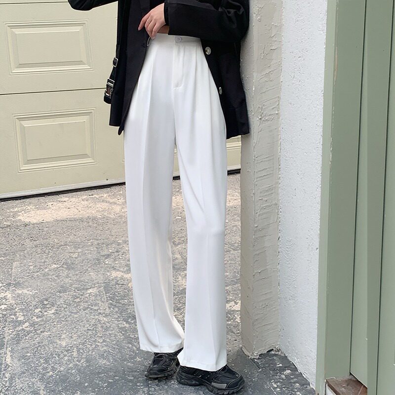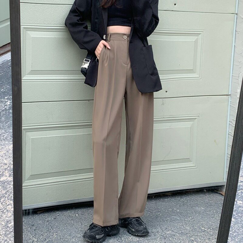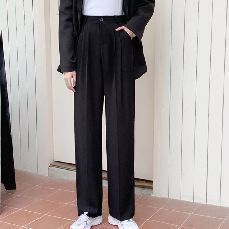 Весенний черный ретро костюм, приталенные штаны, повседневные брюки, коллекция 2021, тренд сезона, эластичная талия, свободный прямой крой