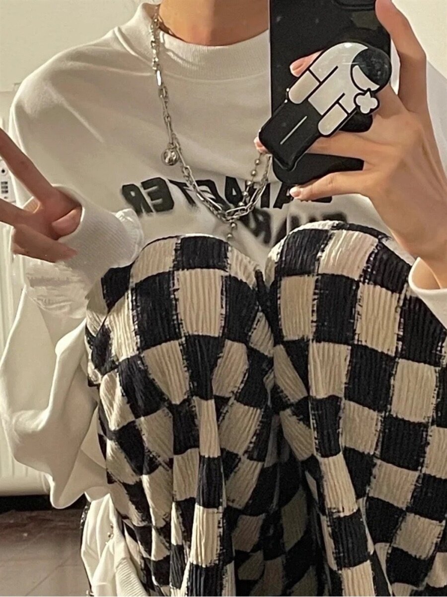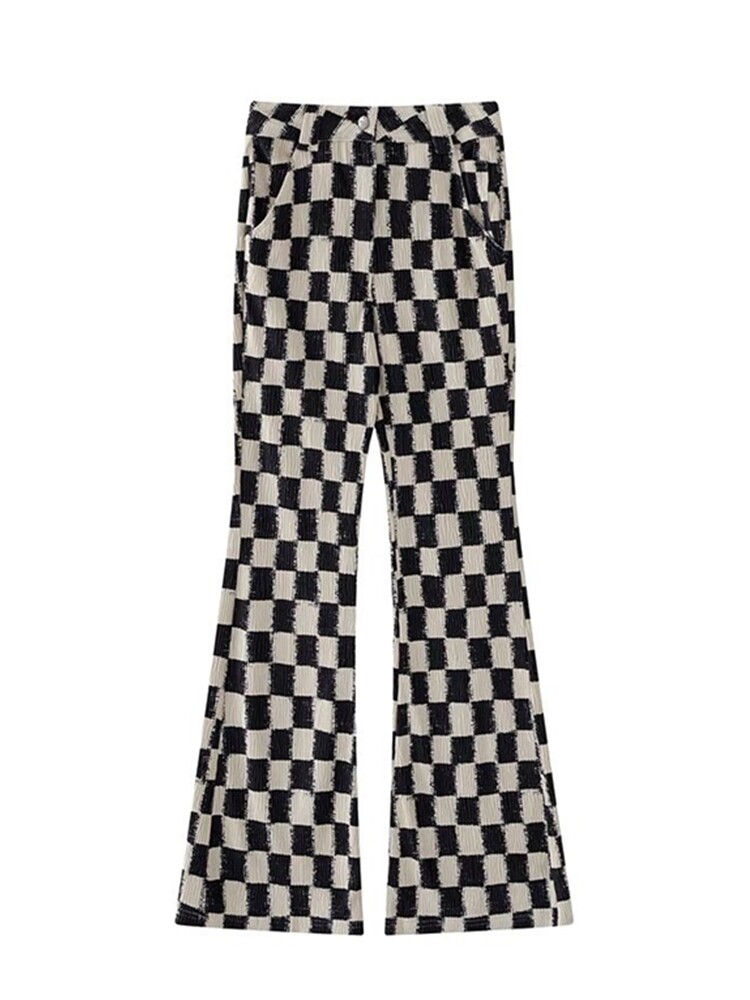 Ретро шахматы, штаны, зимние штаны-клёш, в американском стиле, высокая талия, большой размер