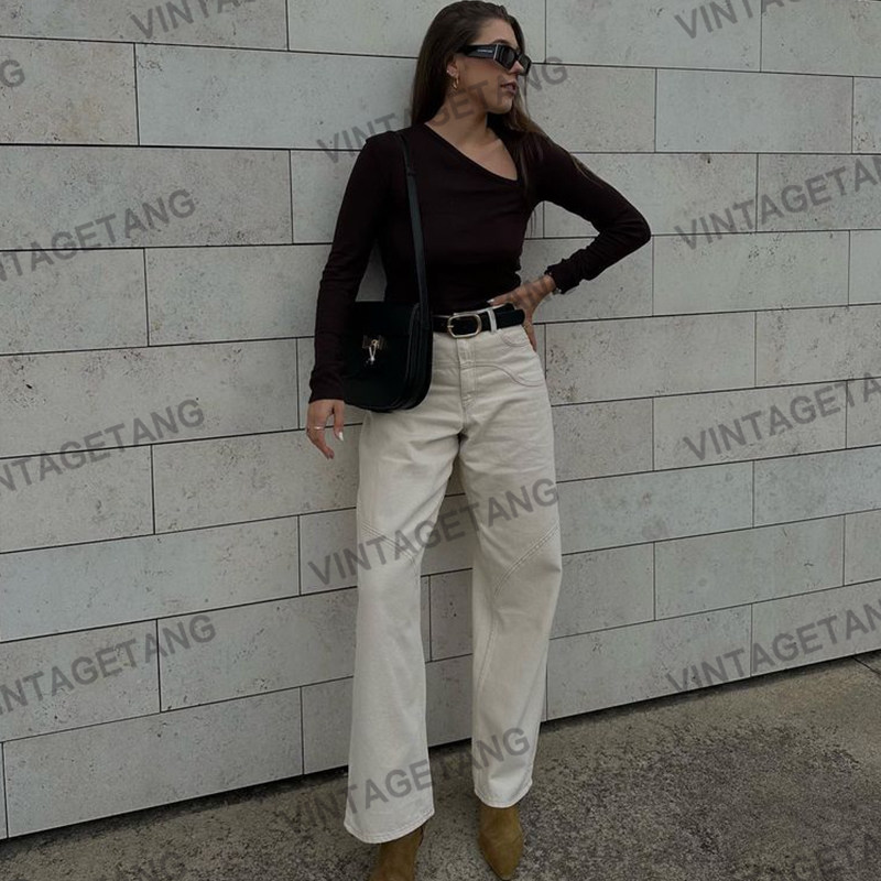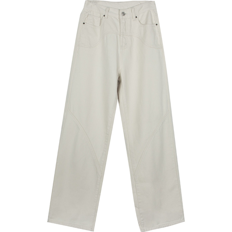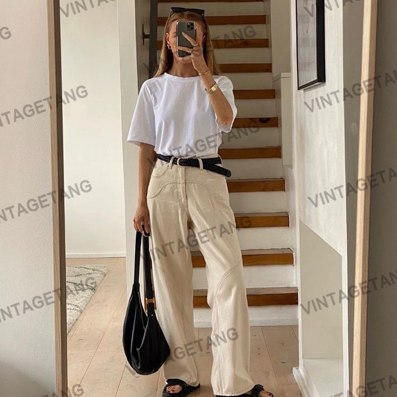 Ретро бежевые штаны, в американском стиле, свободный прямой крой, высокая талия