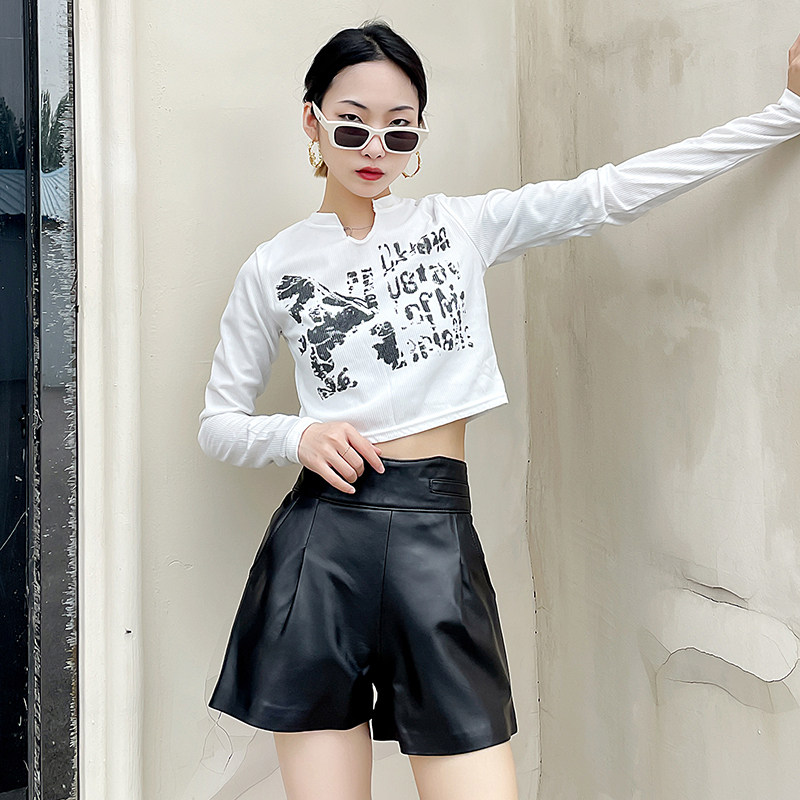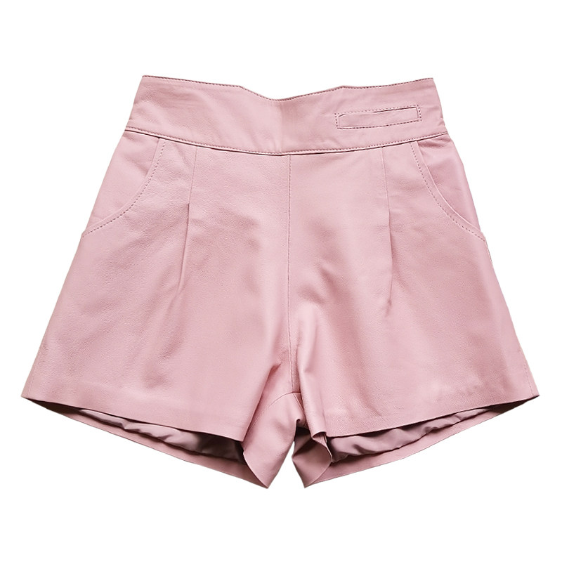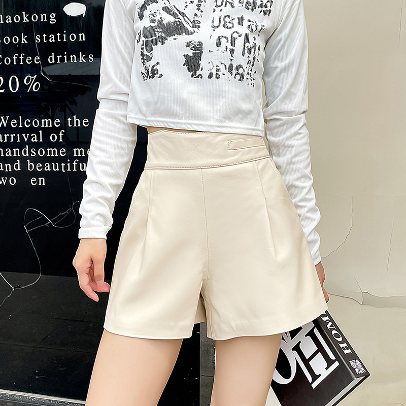 Осенние шорты, белые штаны, высокая талия, из натуральной кожи, А-силуэт, эластичная талия