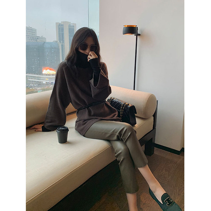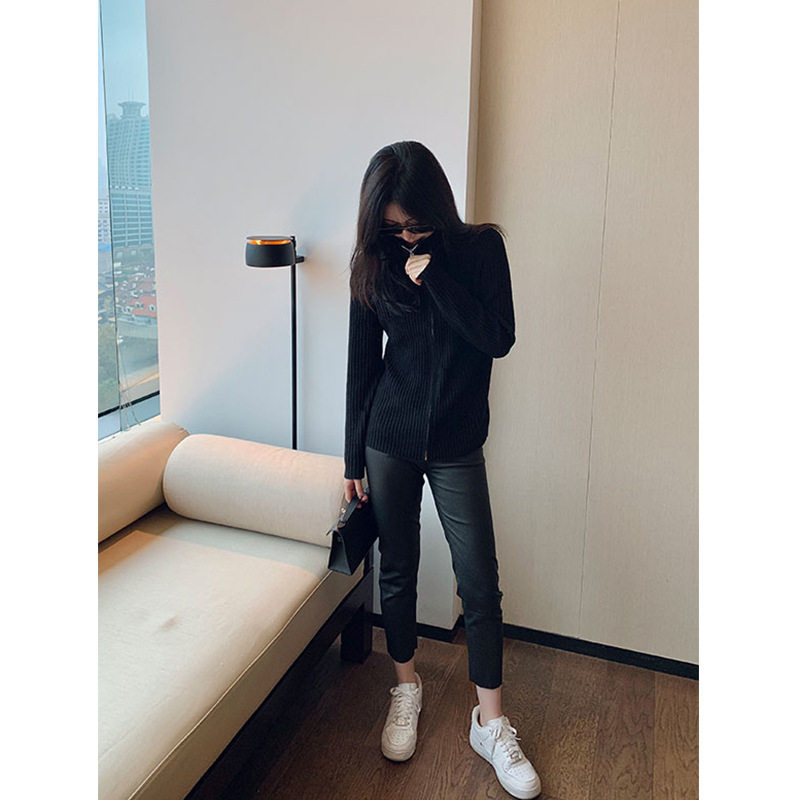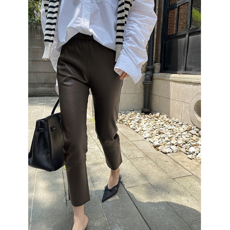 Черные кожаные брюки Женские взрывы ранняя осень высококачественные эластичные портретные брюки девять очков девять очков