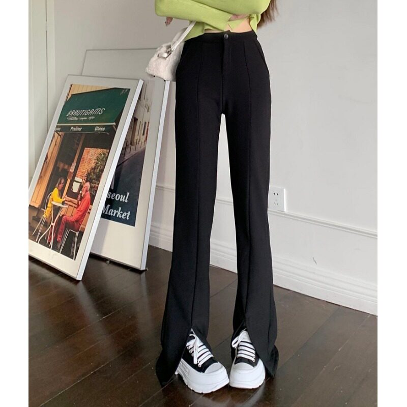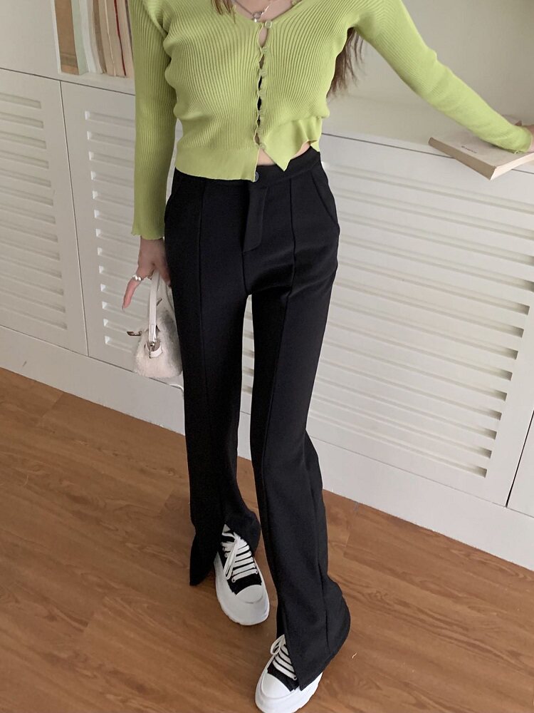Демисезонный утепленный черный мегафон, штаны, приталенный костюм, высокая талия