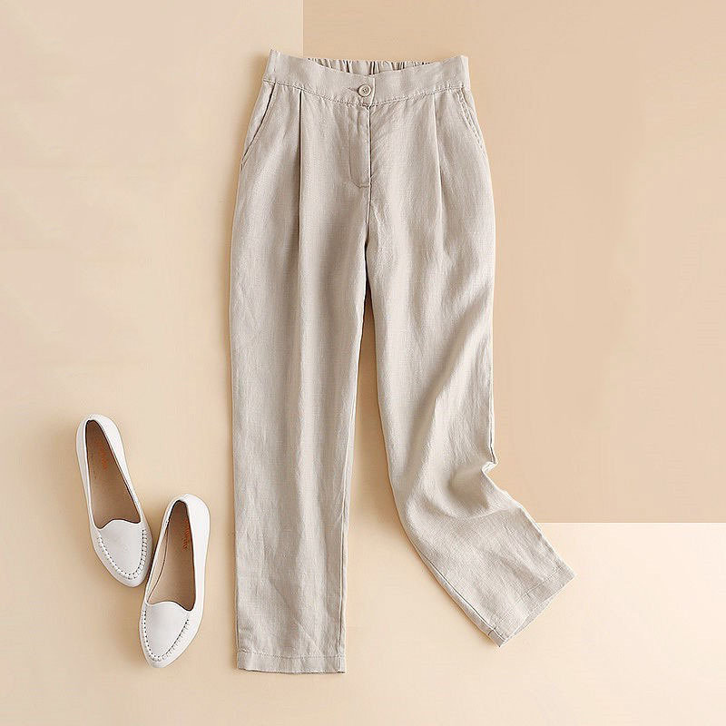 Брендовые штаны для отдыха, высокая талия, из хлопка и льна