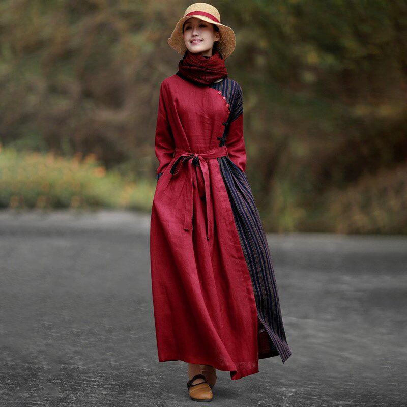 Этническое весеннее платье, длинная юбка, этнический стиль, из хлопка и льна, 2023, длина макси