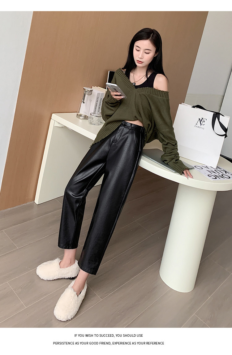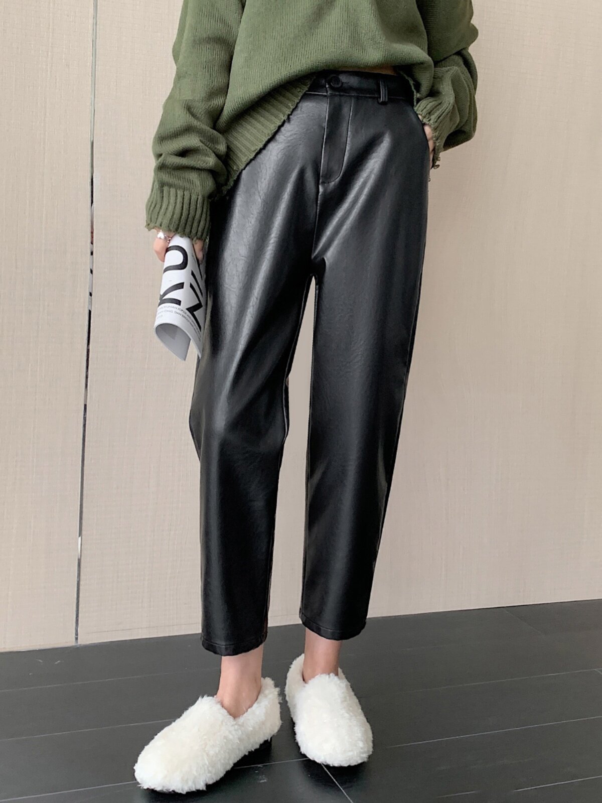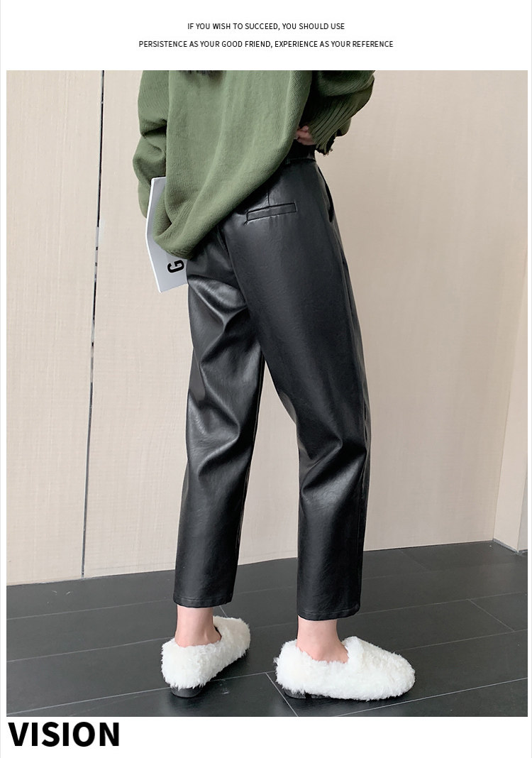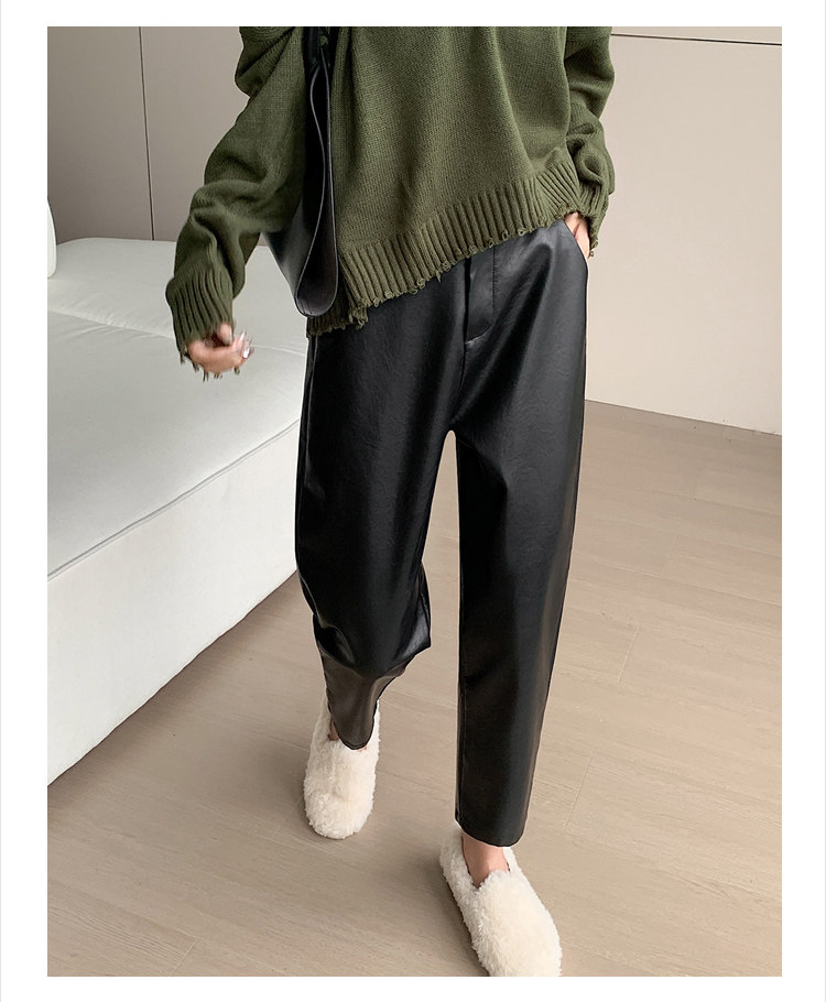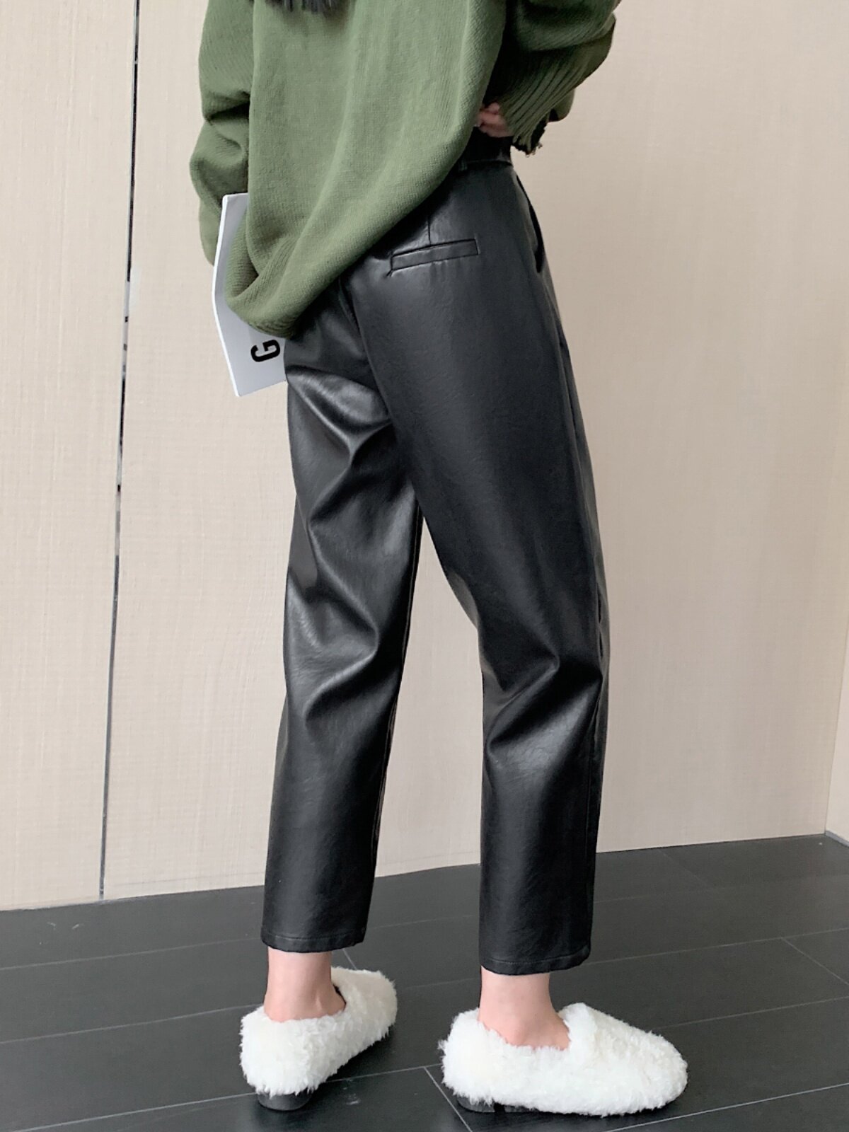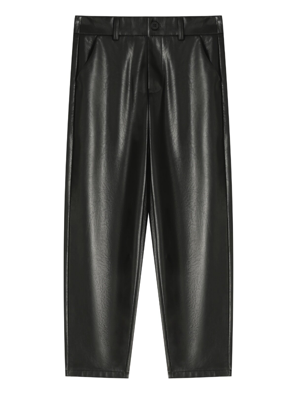 Черные полиуретановые весенние осенние эластичные штаны, свободный прямой крой, высокая талия