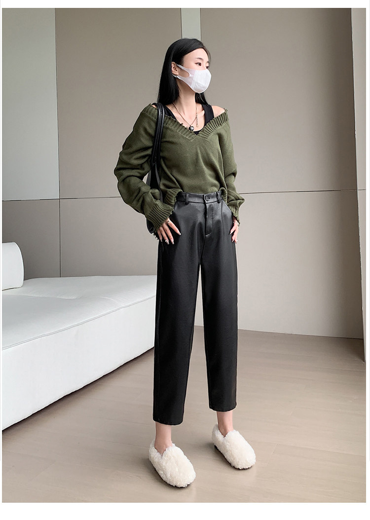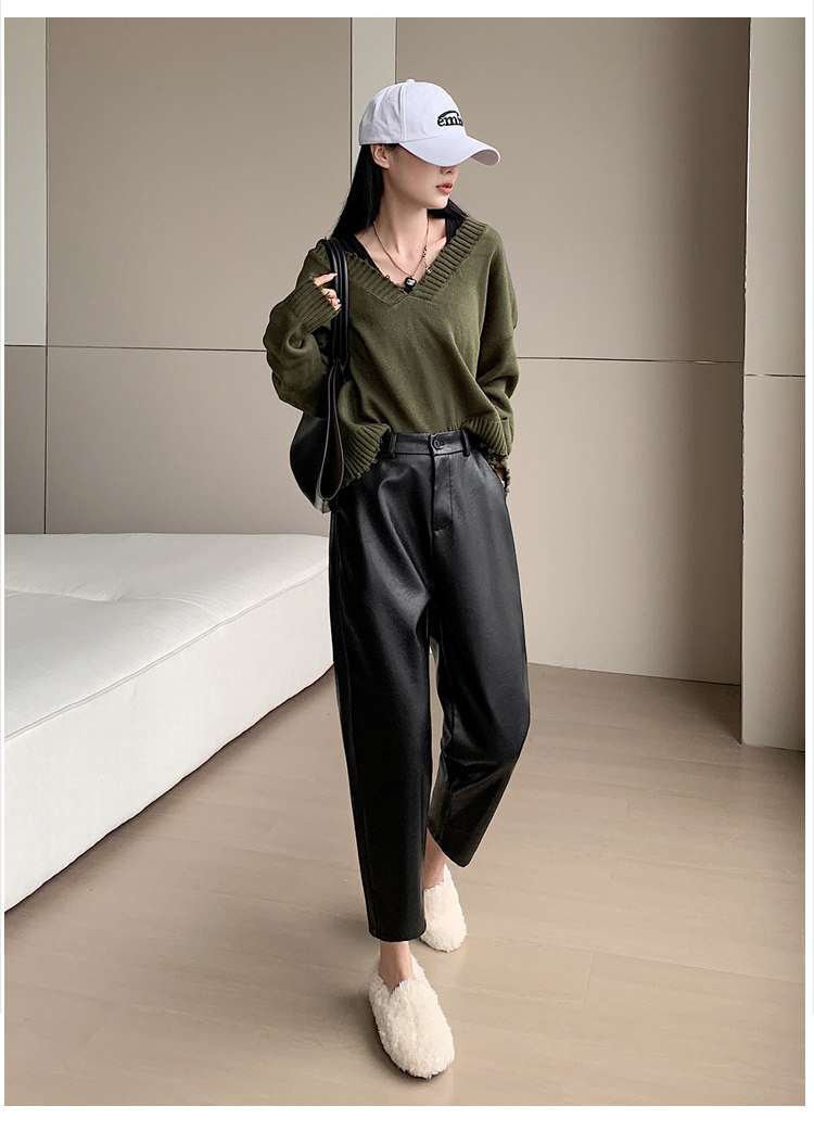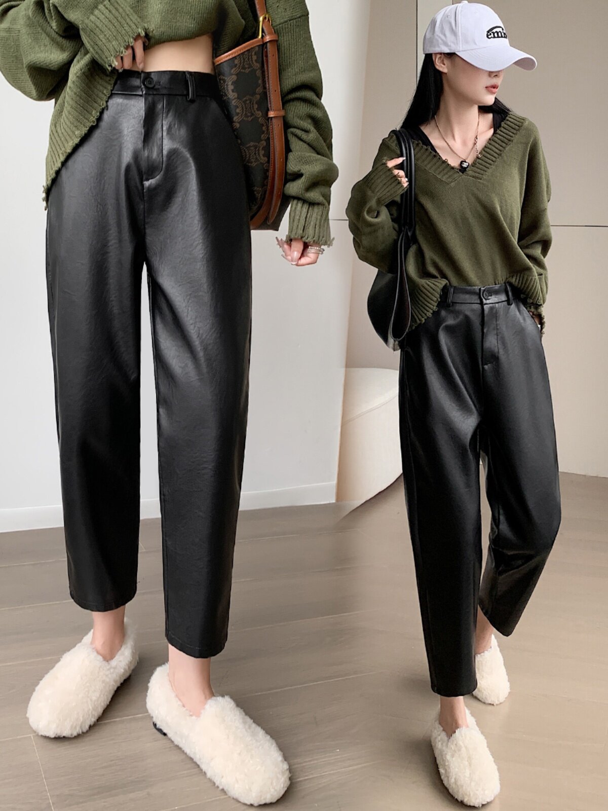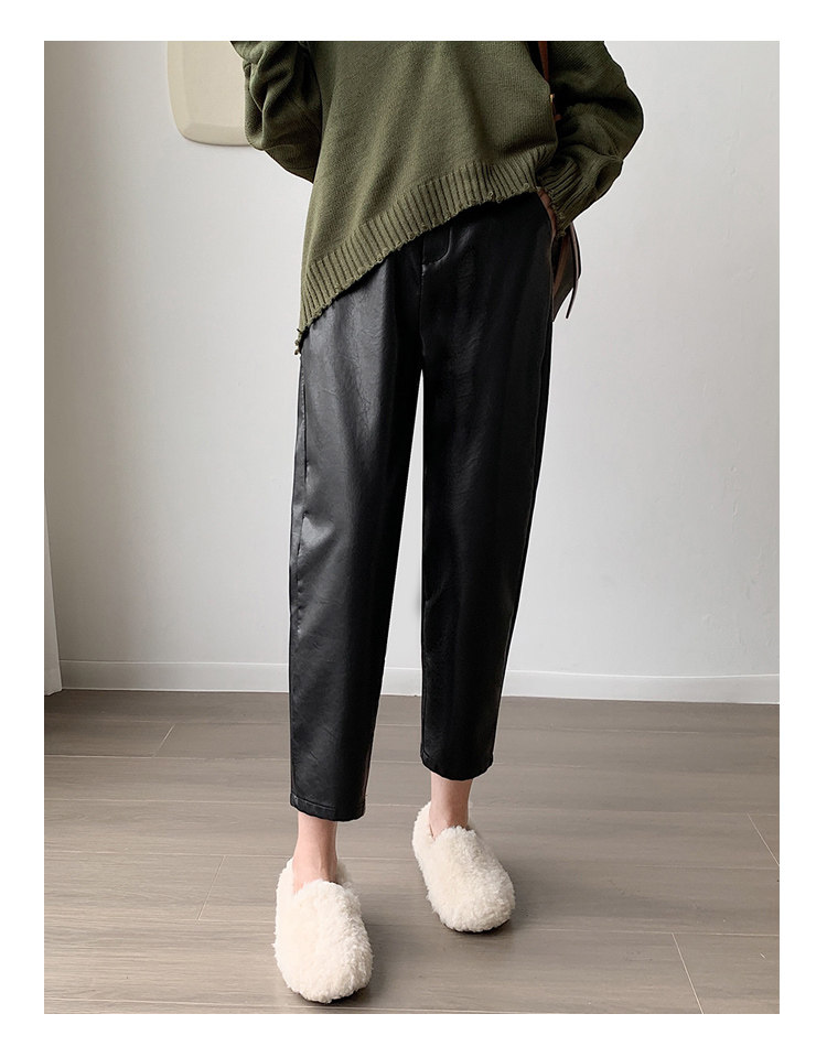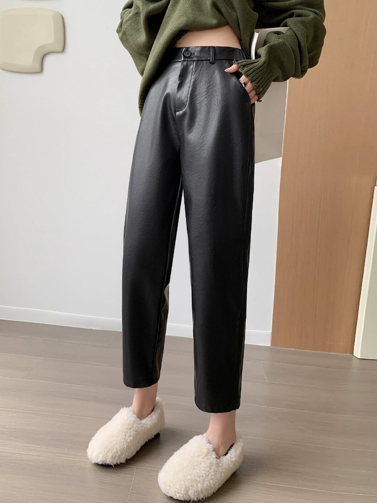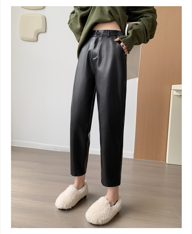Черные полиуретановые весенние осенние эластичные штаны, свободный прямой крой, высокая талия