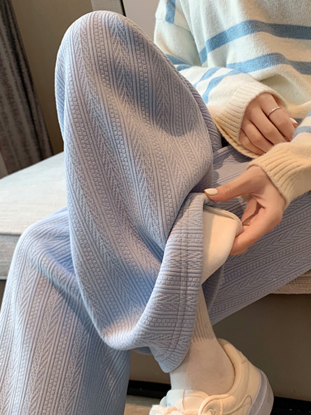 Синие демисезонные утепленные штаны, трикотажные вельветовые леггинсы, свободный прямой крой, изысканный стиль