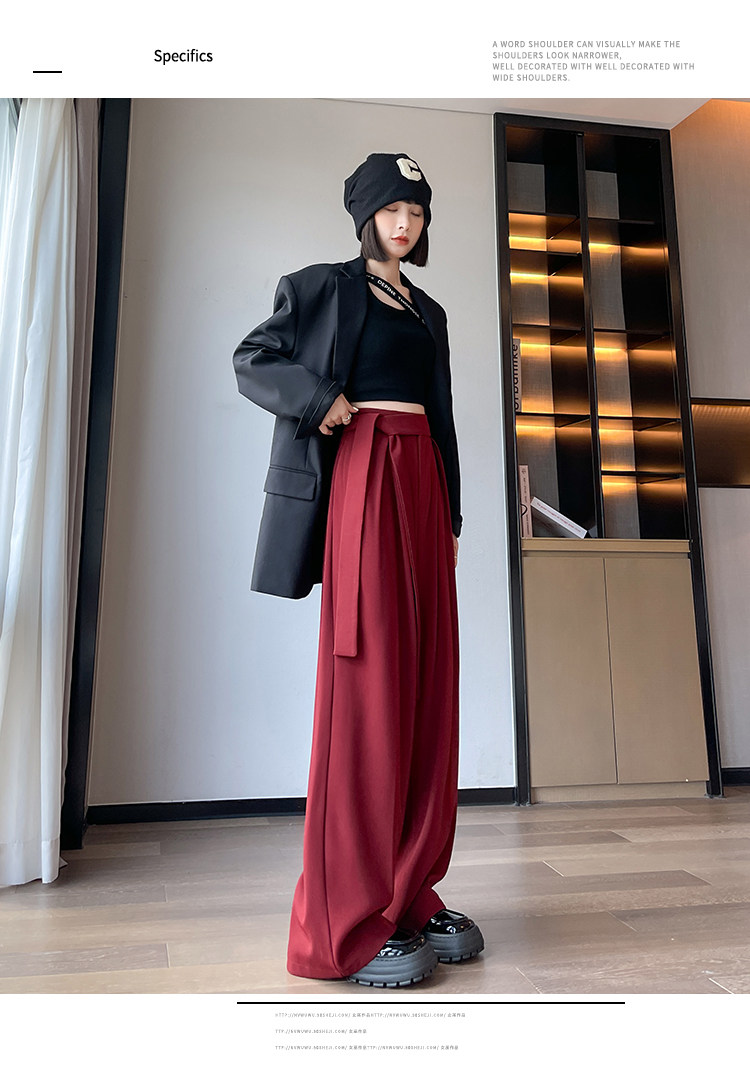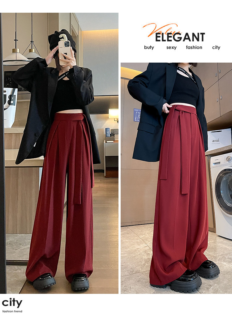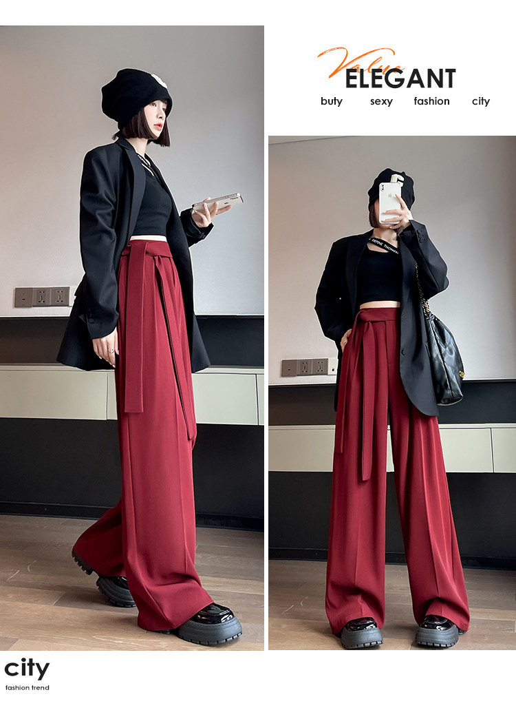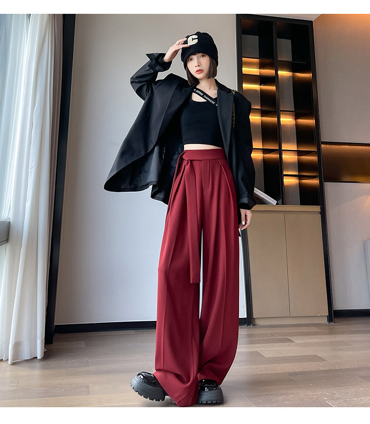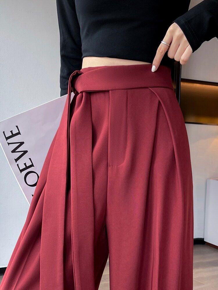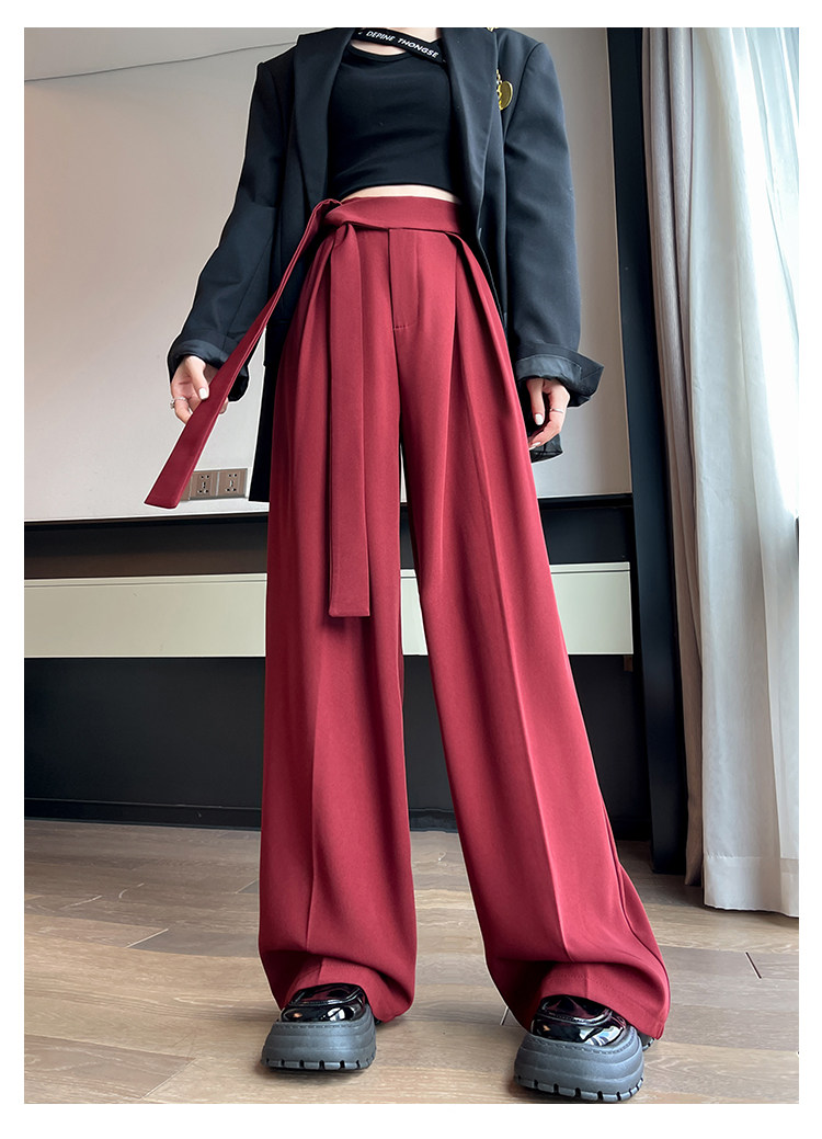 Красный пиджак классического кроя, весенние штаны, дизайнерский длинный ремень, тренд сезона, высокая талия, свободный прямой крой