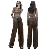 Коричневые штаны, осенние, свободный прямой крой, высокая талия, большой размер