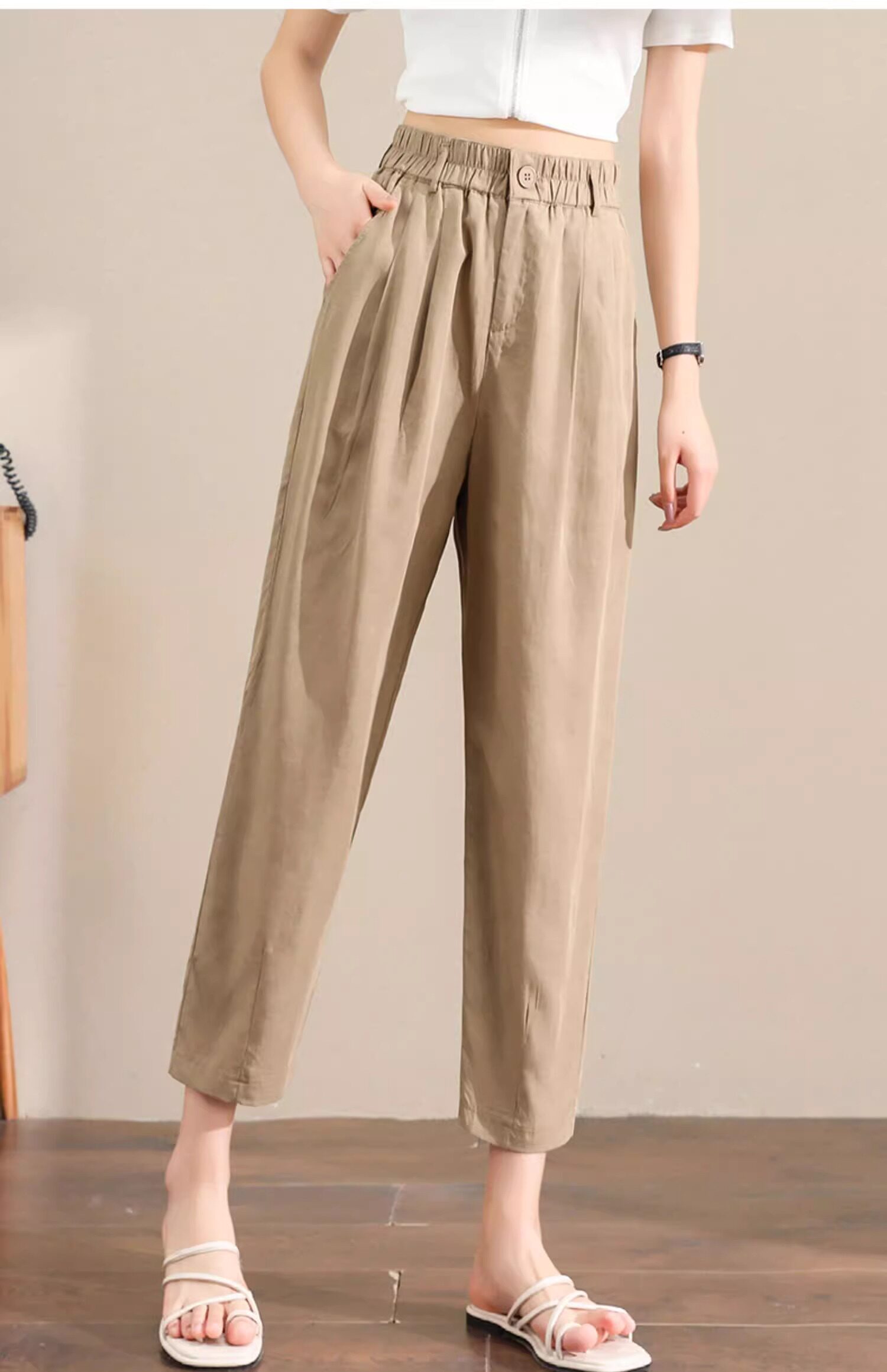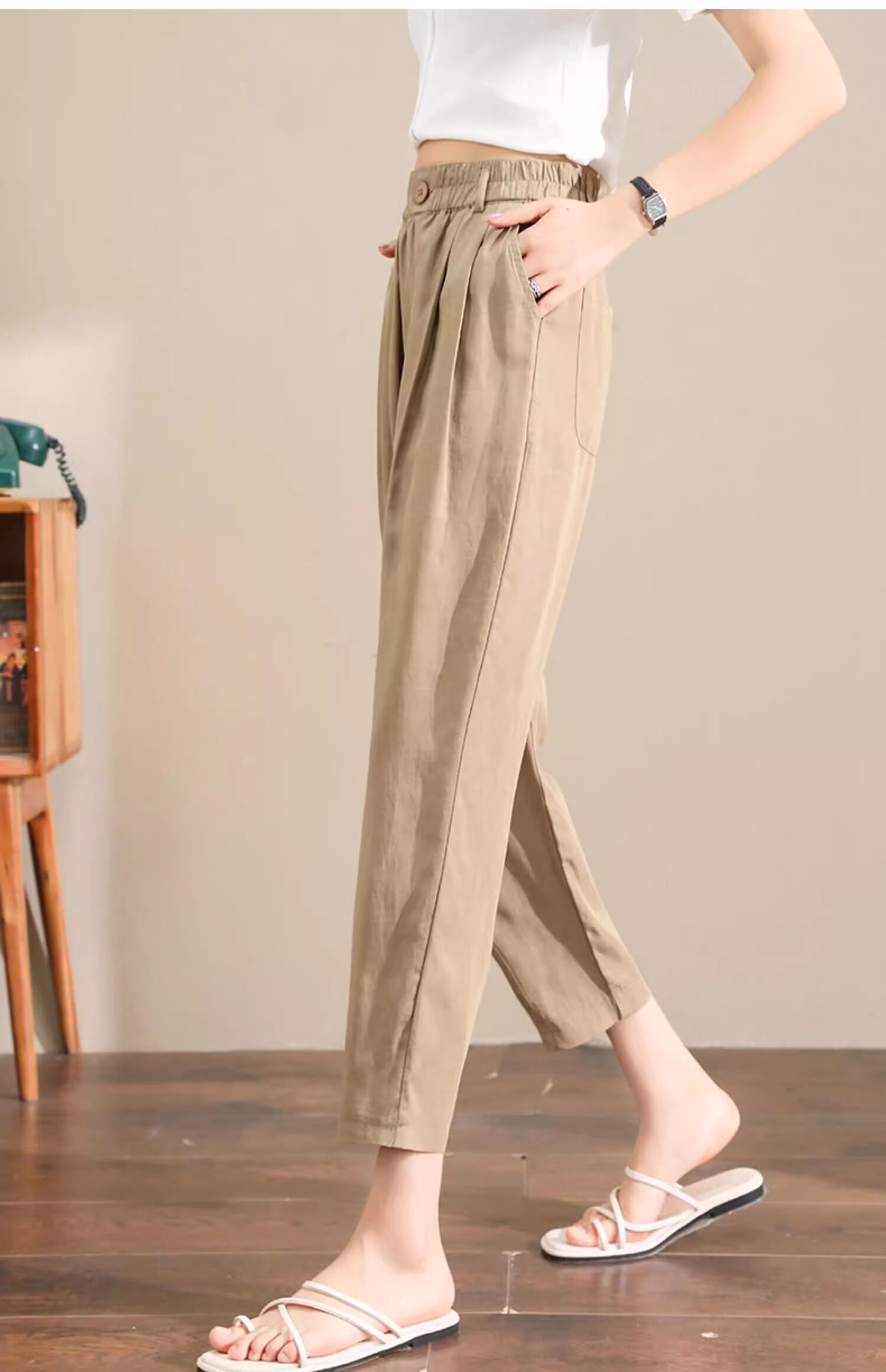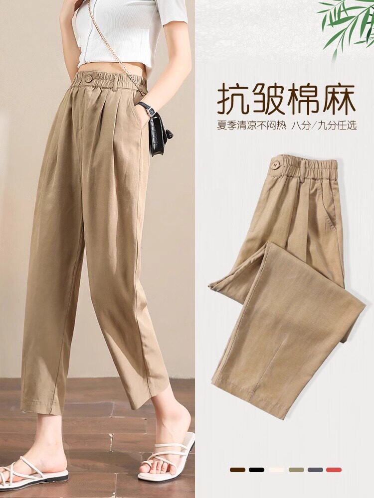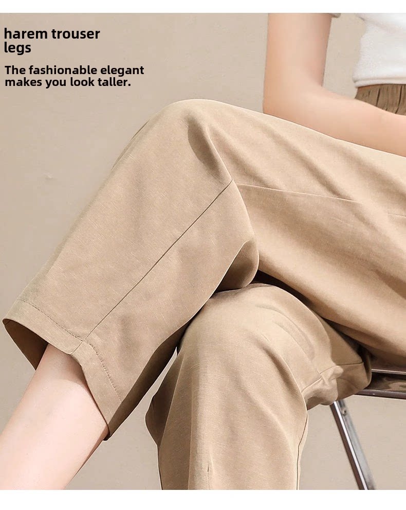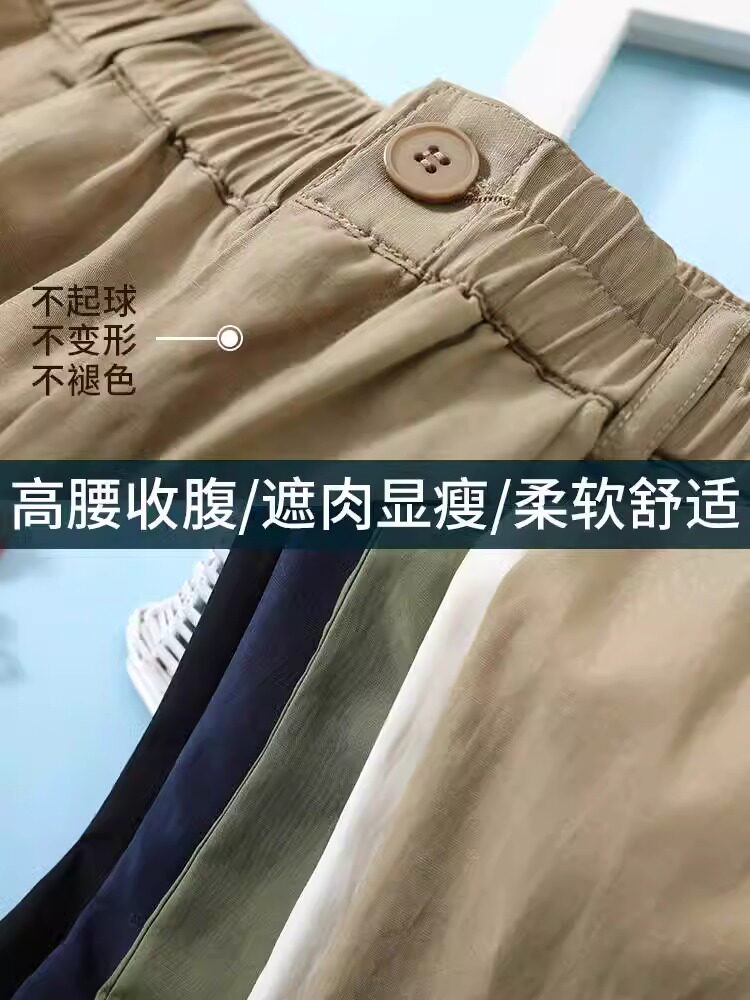 Женщины с хаки крошечные шелковые хлопковые и льняные брюки летом, высокая талия, выглядящая в воздухопроницаемых мани миниатюрных брюк для льня