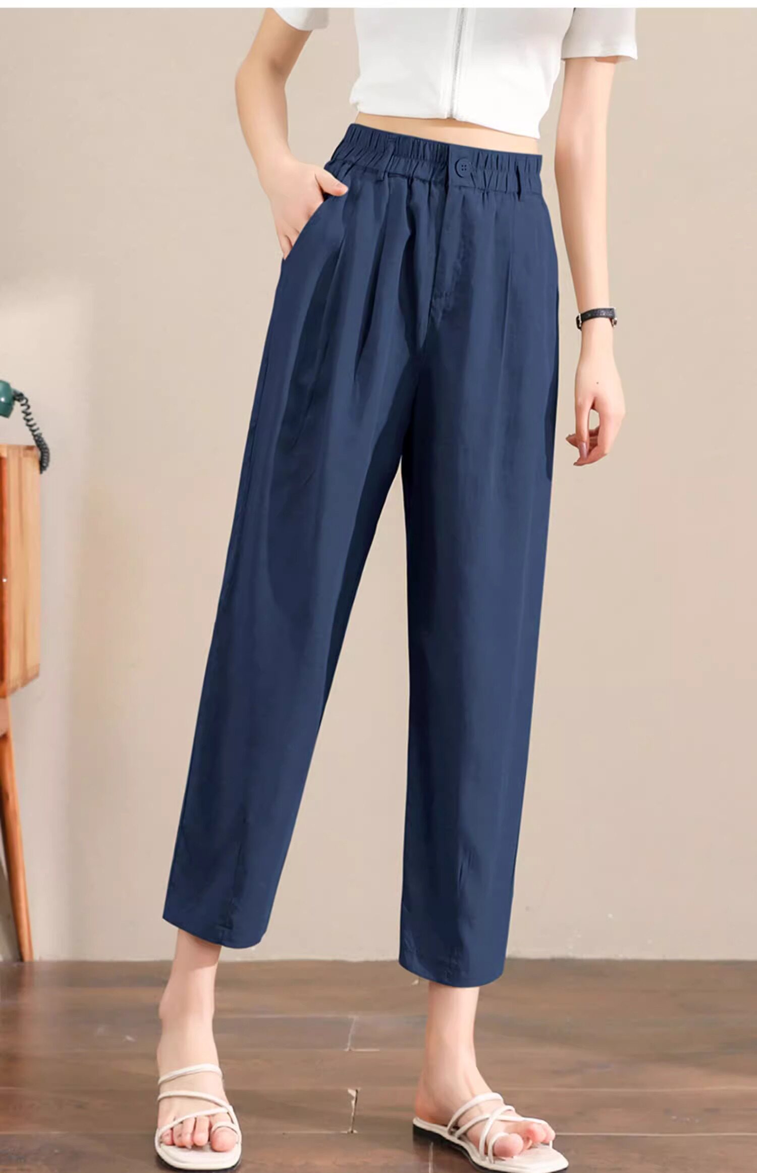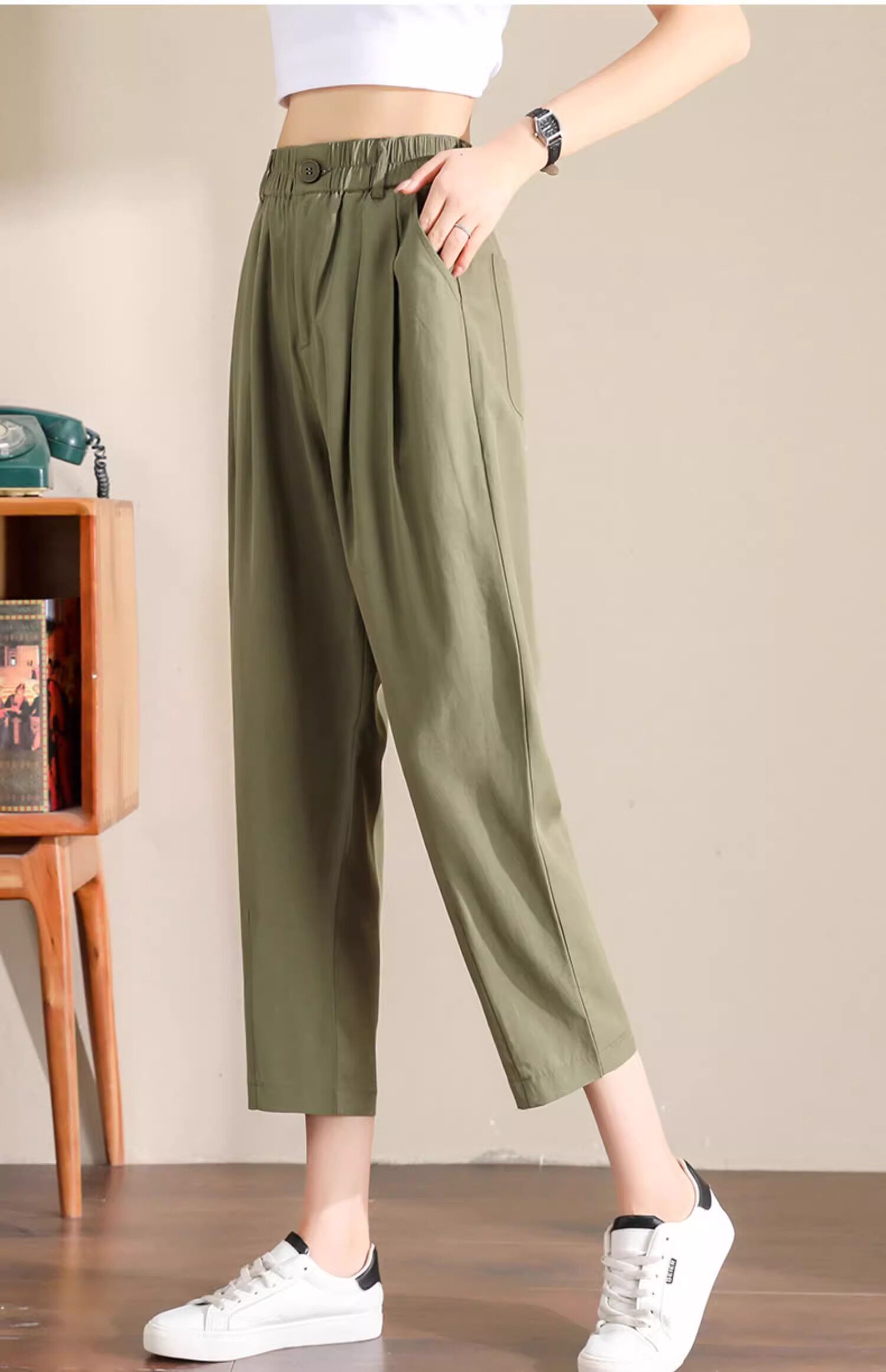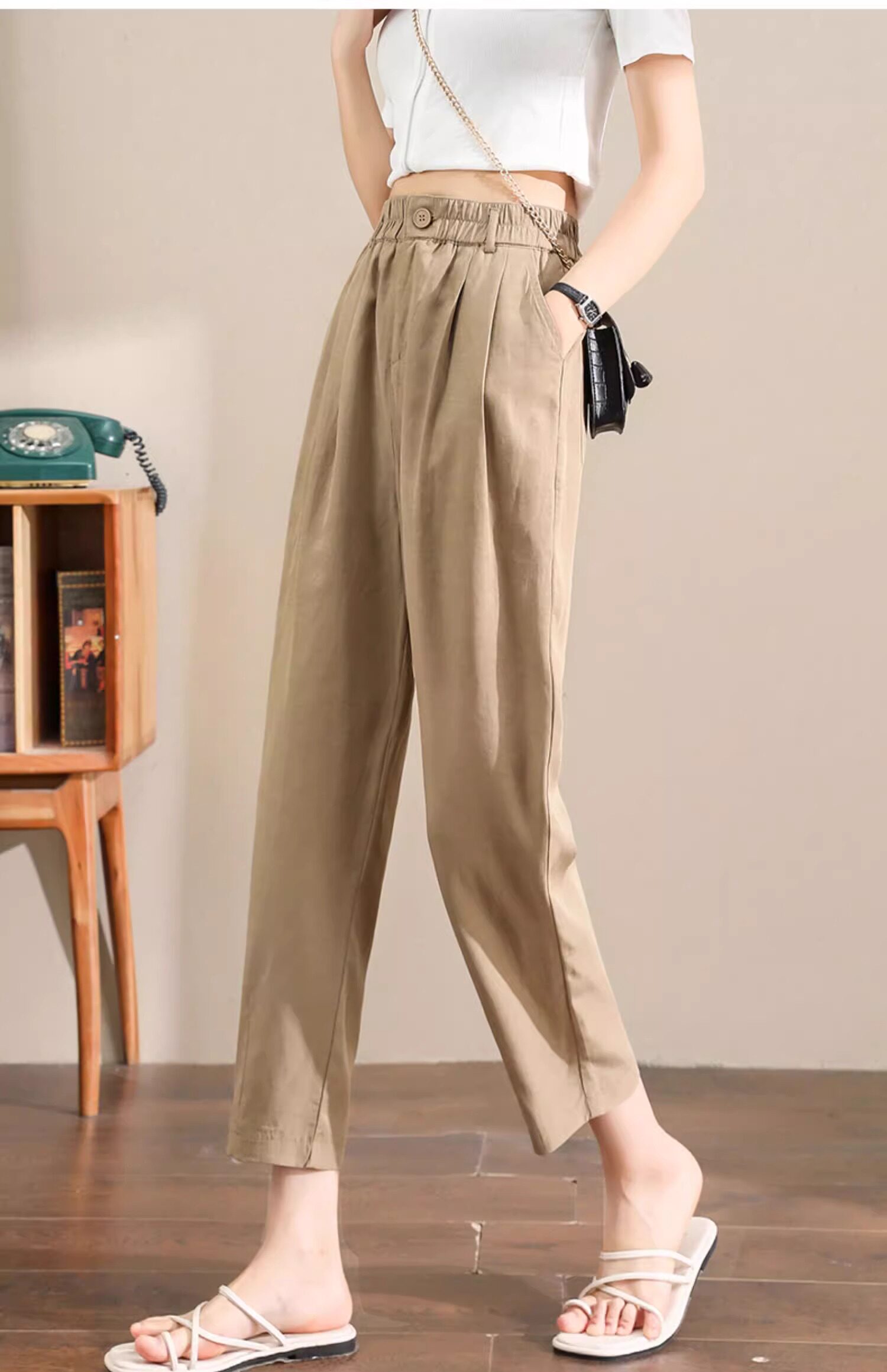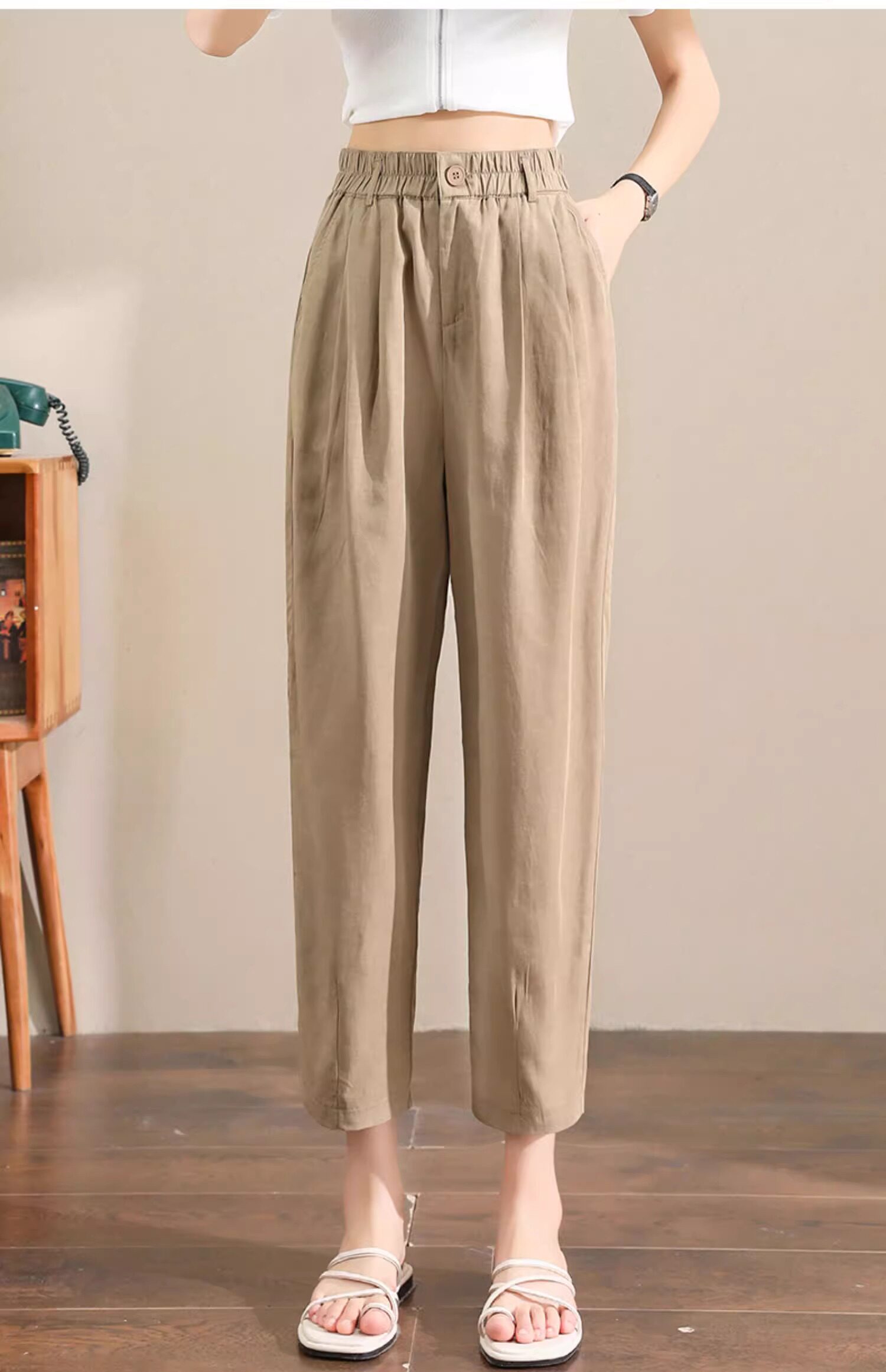 Женщины с хаки крошечные шелковые хлопковые и льняные брюки летом, высокая талия, выглядящая в воздухопроницаемых мани миниатюрных брюк для льня