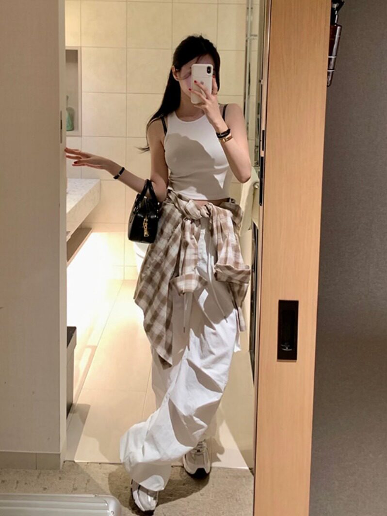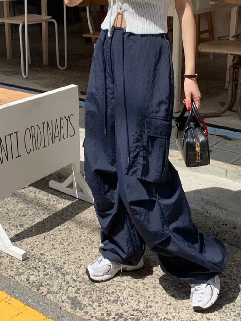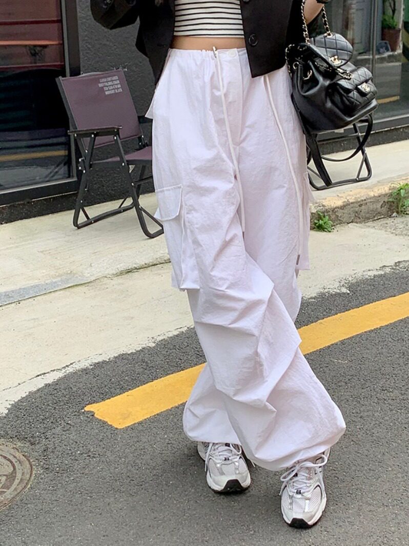 Южнокорейский товар, белые штаны, на шнурках, эластичная талия, свободный прямой крой
