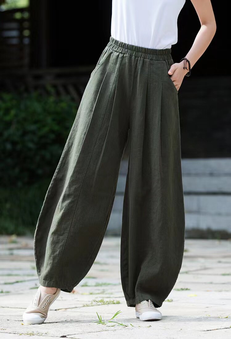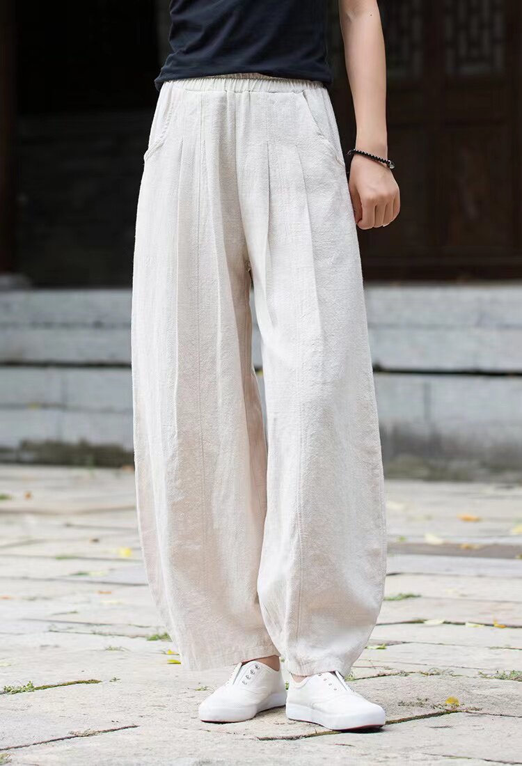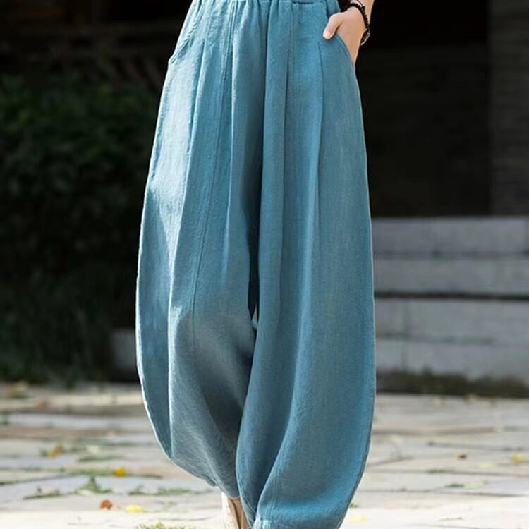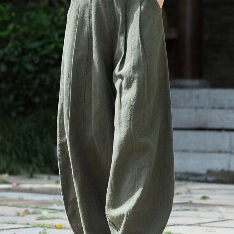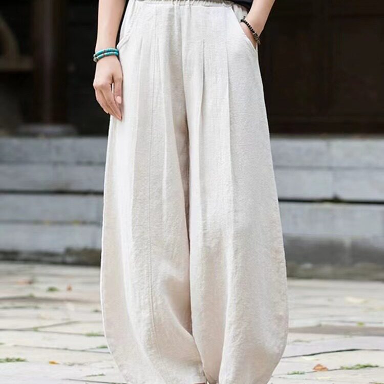 Модные универсальные демисезонные ретро штаны, фонарь, из хлопка и льна, свободный прямой крой