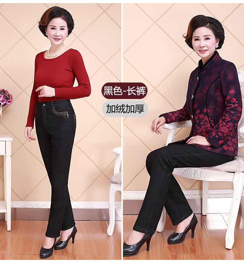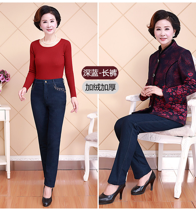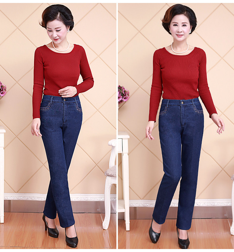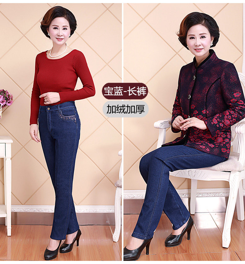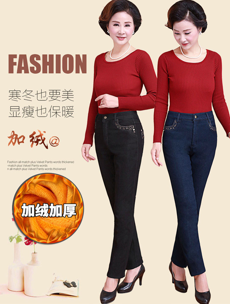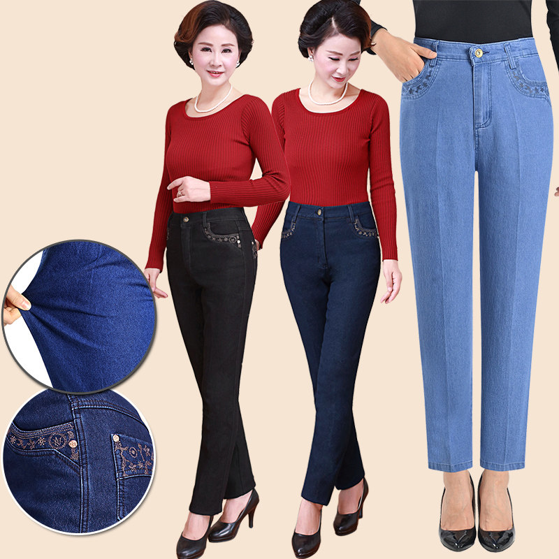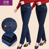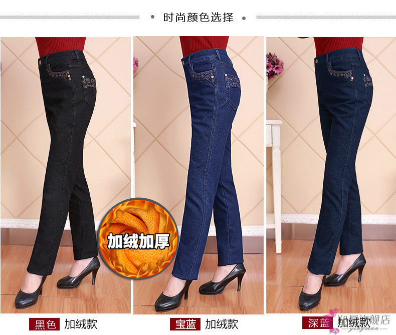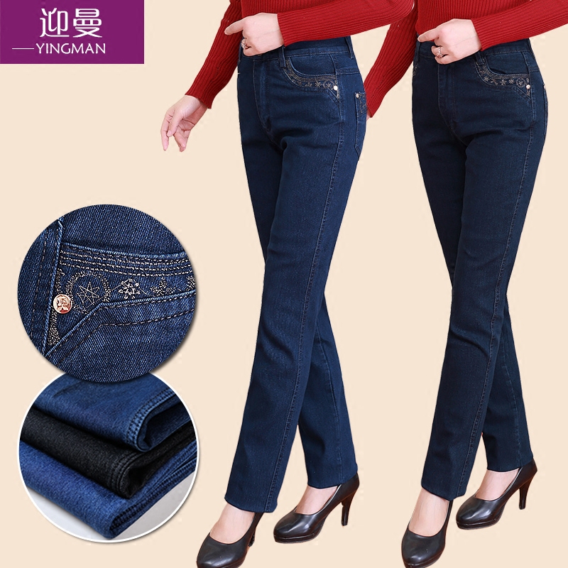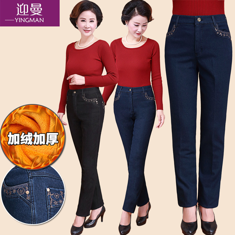 Демисезонные джинсы, флисовые эластичные штаны, для среднего возраста, высокая талия, размер, свободный прямой крой, увеличенная толщина