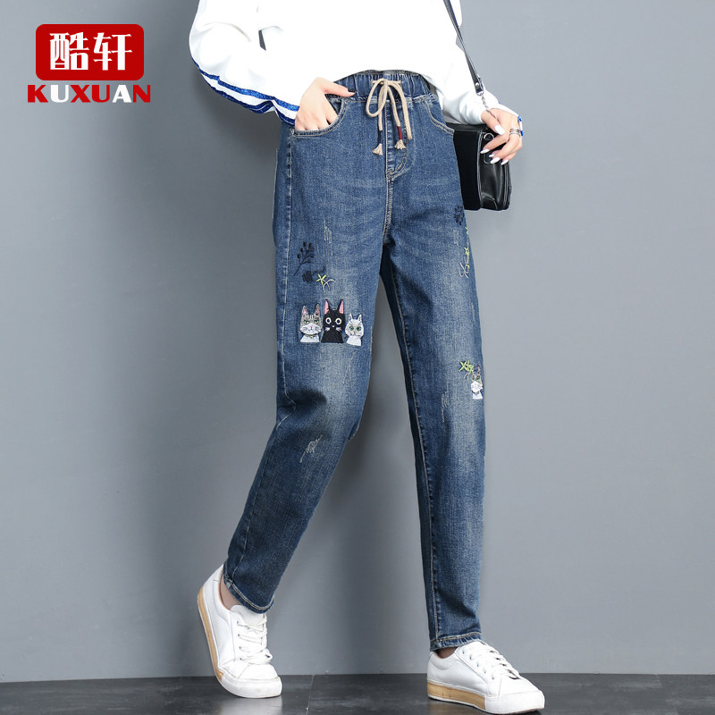 Джинсы, штаны, эластичная талия, коллекция 2023, оверсайз, высокая талия, с вышивкой, большой размер