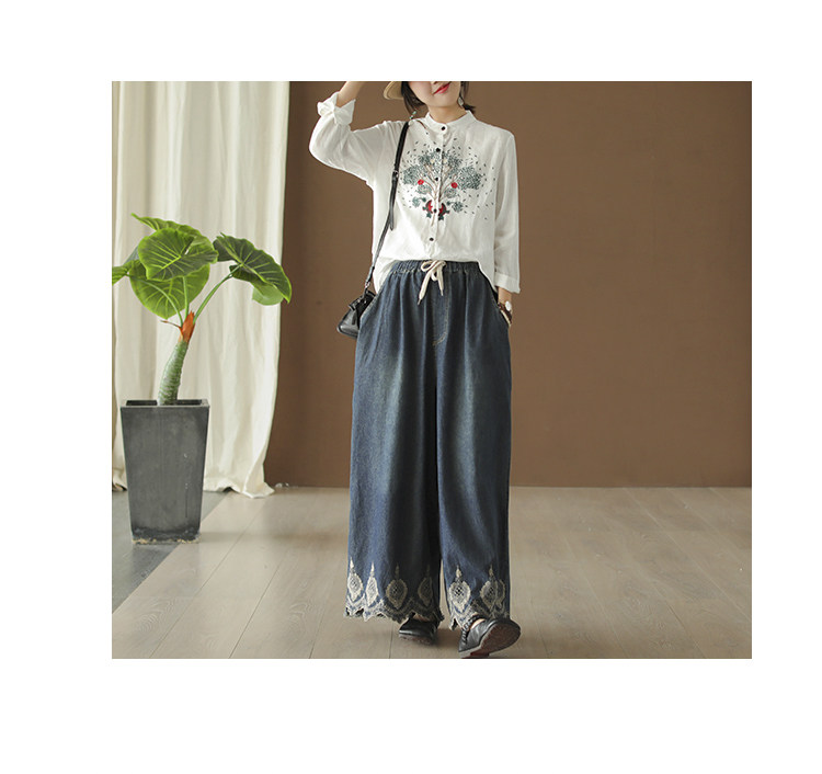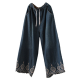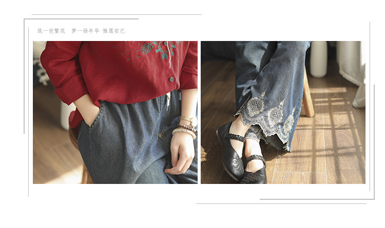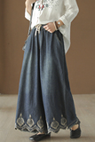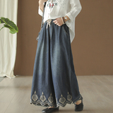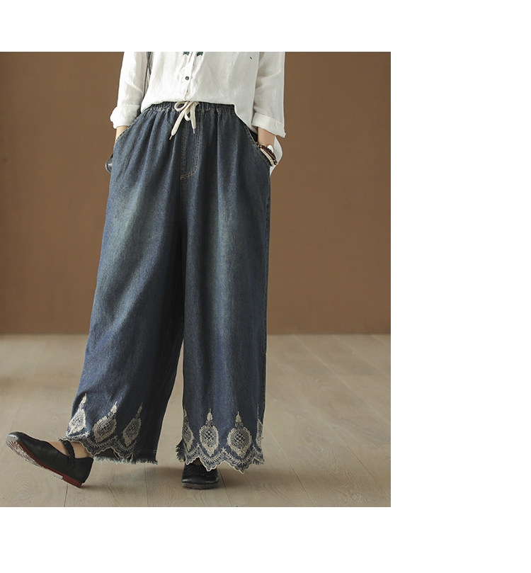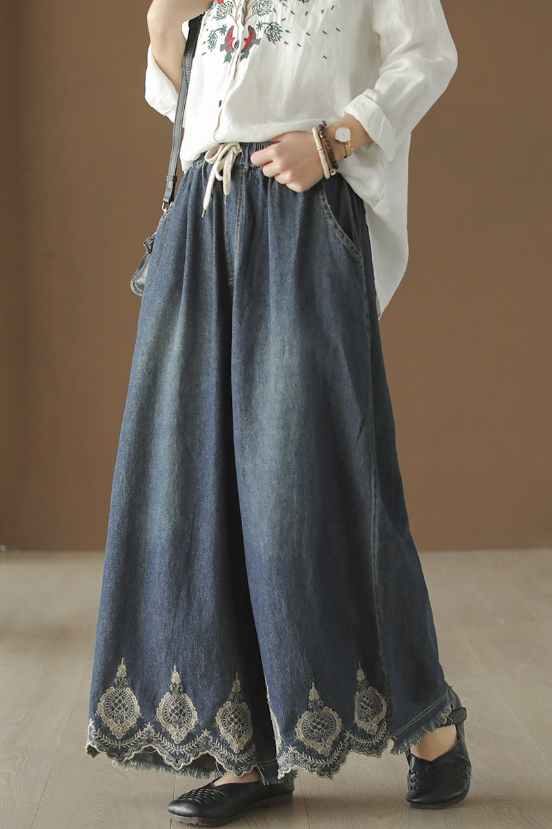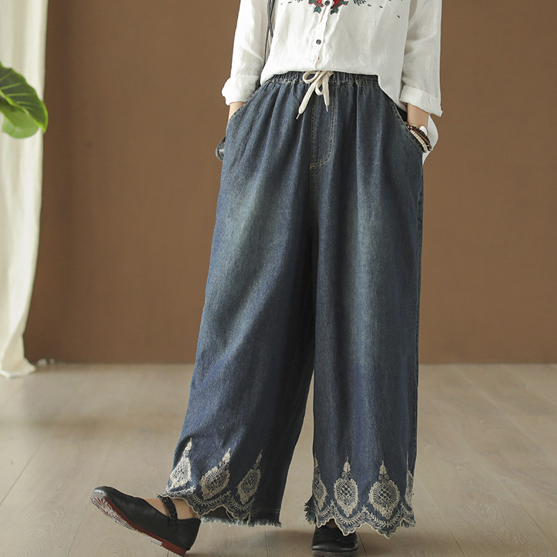 Хлопковые джинсовые весенние ретро штаны, с вышивкой, эластичная талия