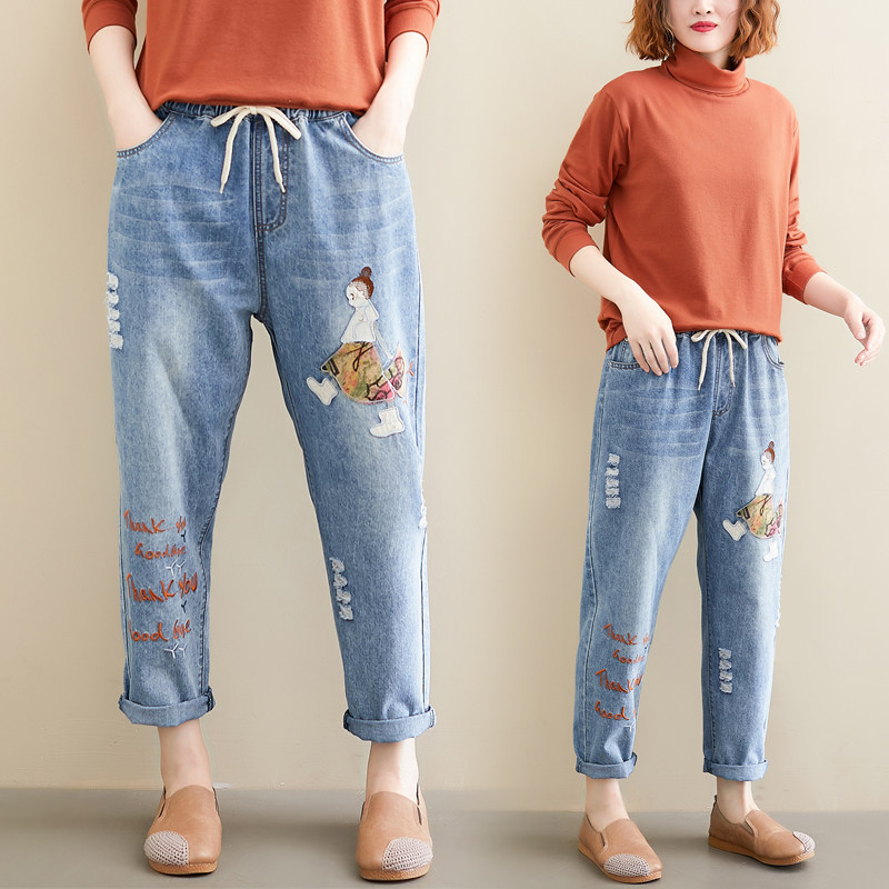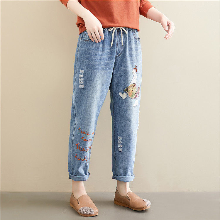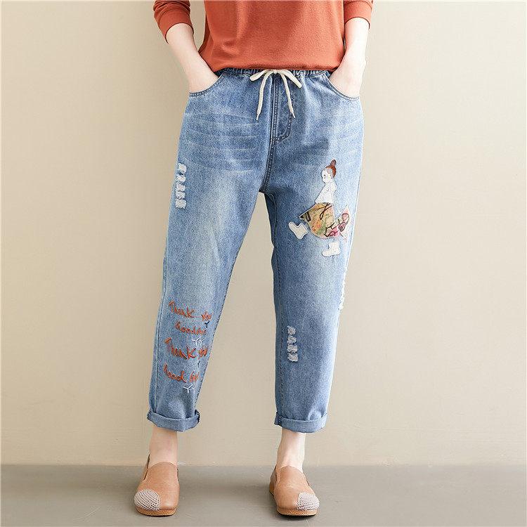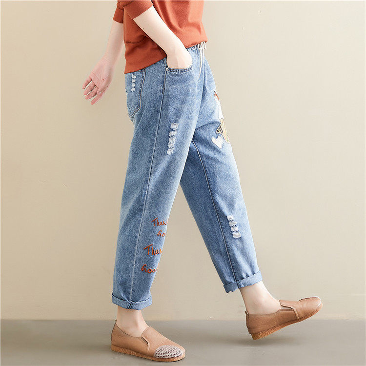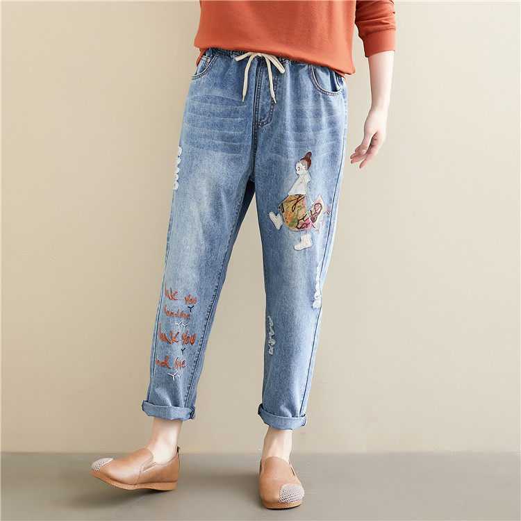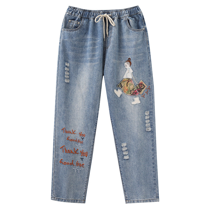 Весенние мультяшные джинсы, универсальные штаны, в корейском стиле, большой размер, с вышивкой, эластичная талия