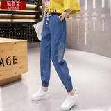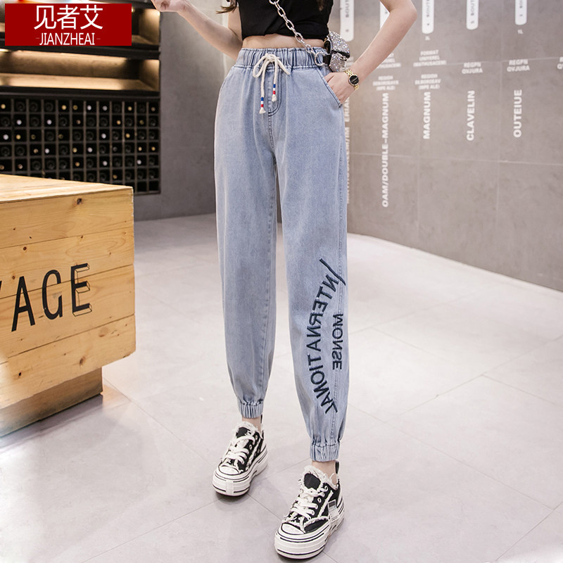 Джинсы для школьников для отдыха, приталенные брендовые весенние штаны, высокая талия, эластичная талия, с вышивкой