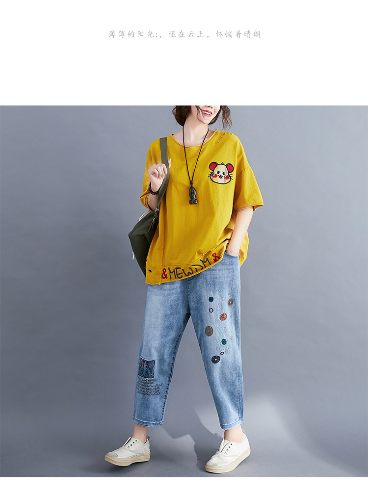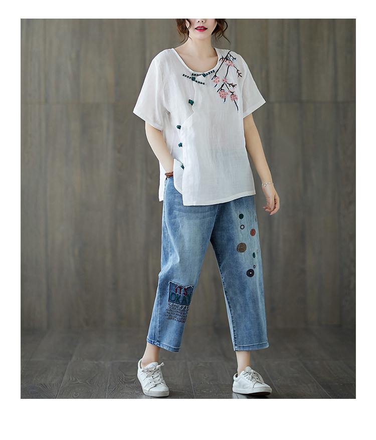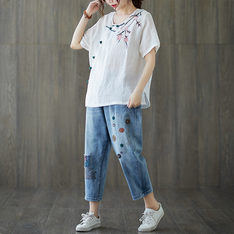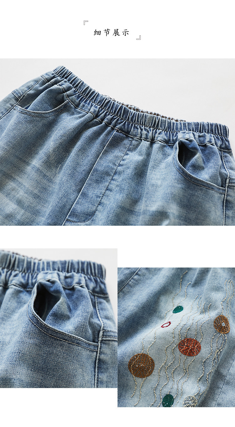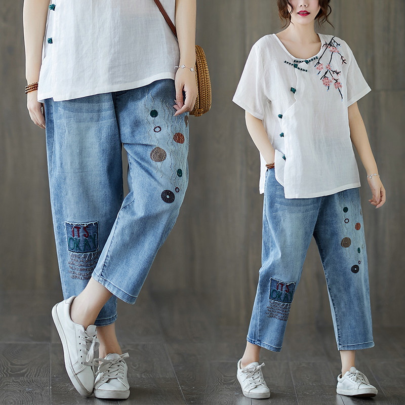 Летние штаны, джинсы, большой размер, высокая талия, с вышивкой
