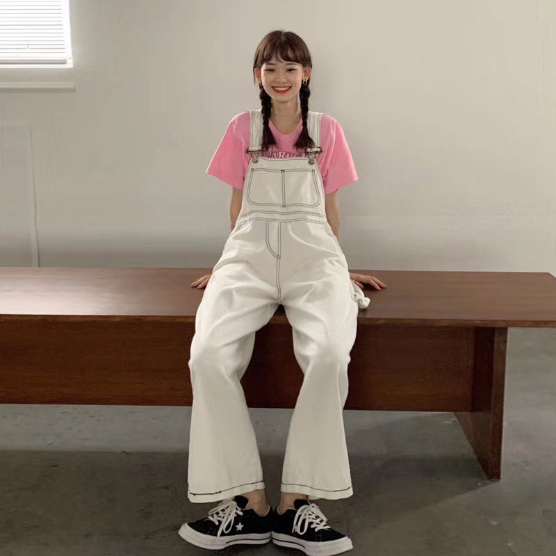 Японский белый джинсовый ретро комбинезон, штаны, милые джинсы, свободный крой