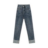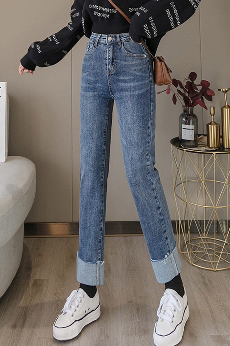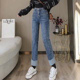 Джинсы, эластичные осенние штаны, в корейском стиле, оверсайз, высокая талия, свободный прямой крой