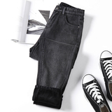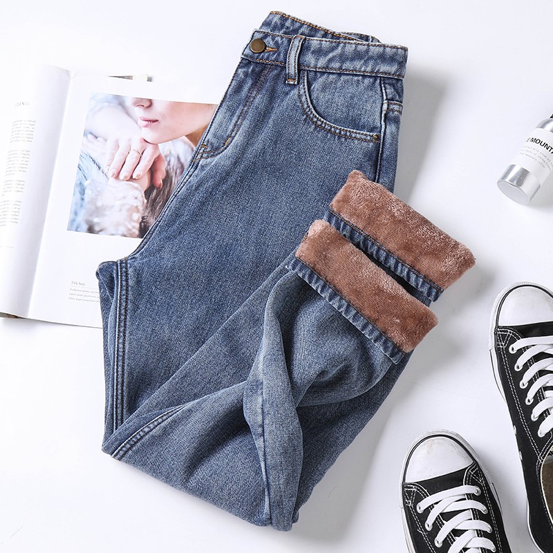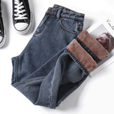 Зимние джинсы с начесом, штаны, высокая талия, свободный прямой крой