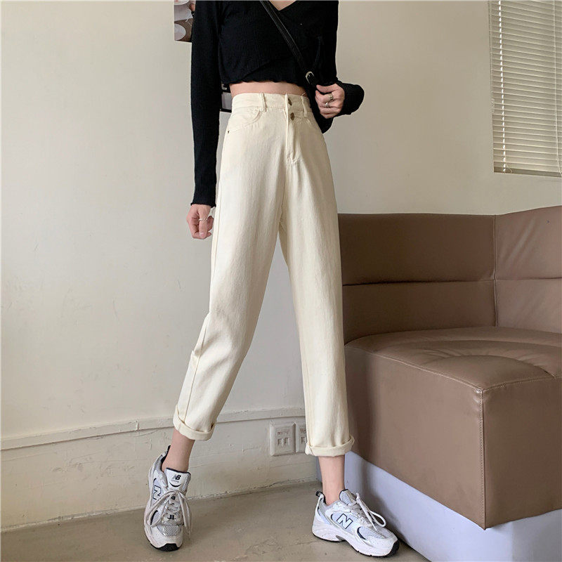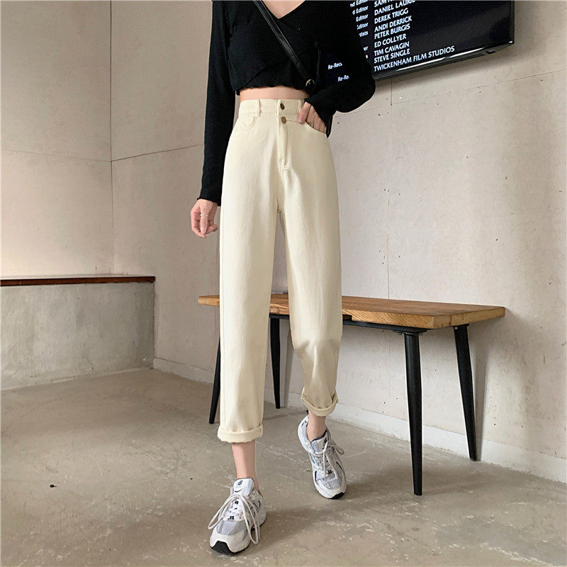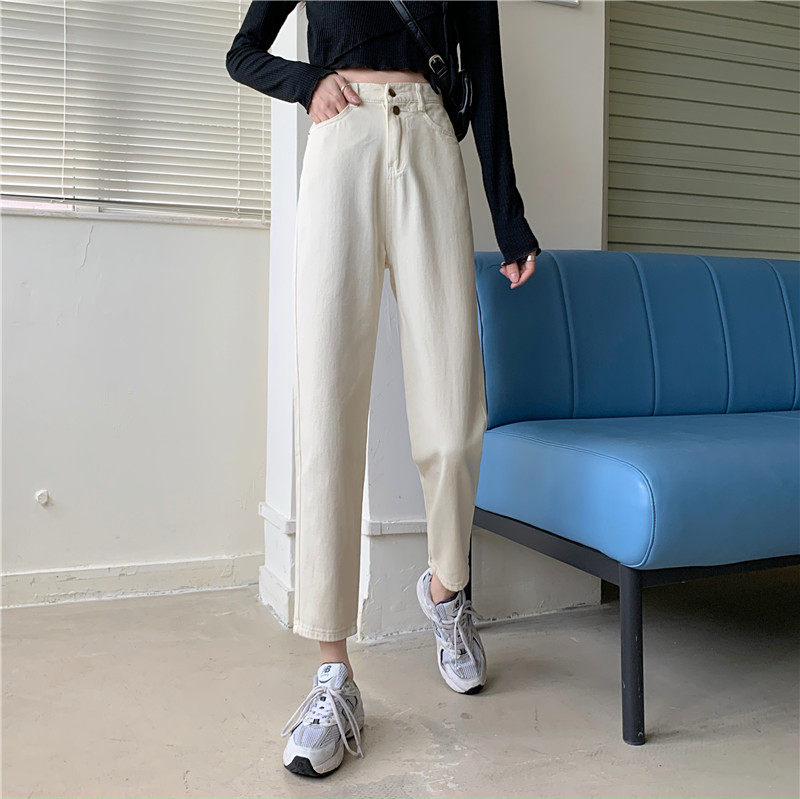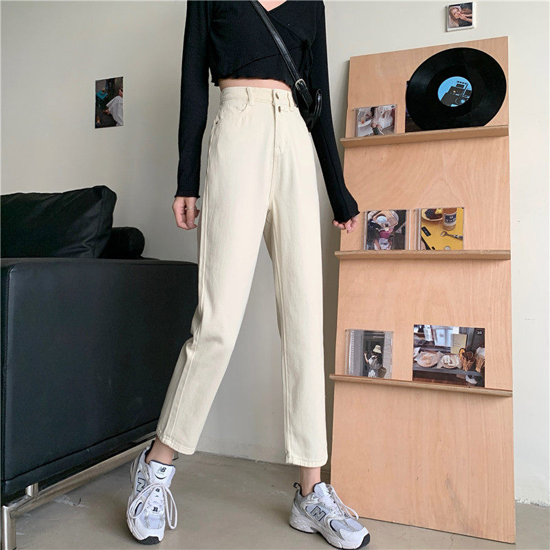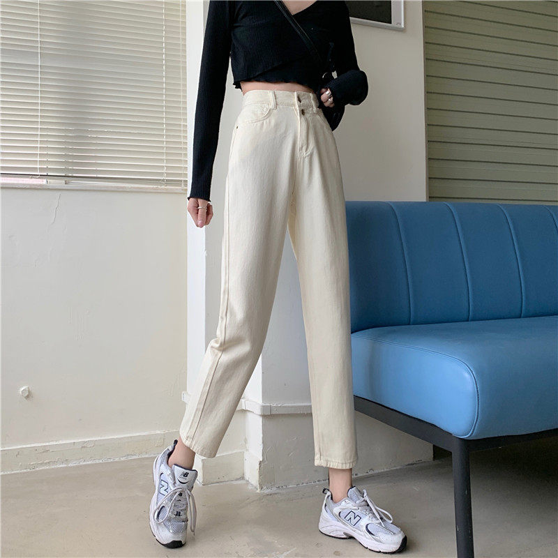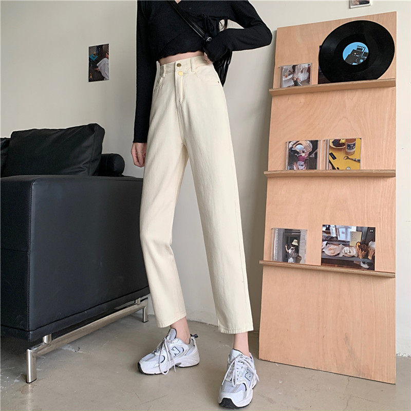 Бежевые осенние джинсы, штаны, эластичная талия, высокая талия, свободный прямой крой, оверсайз