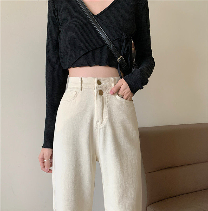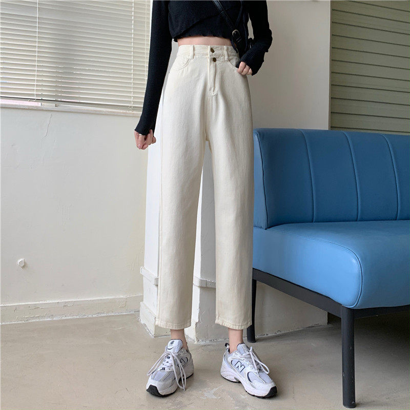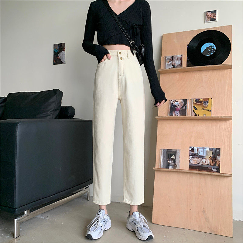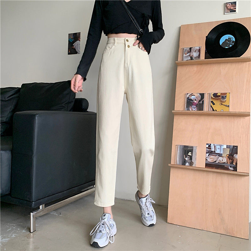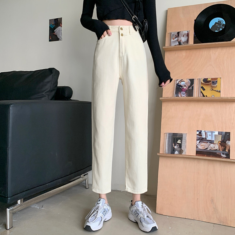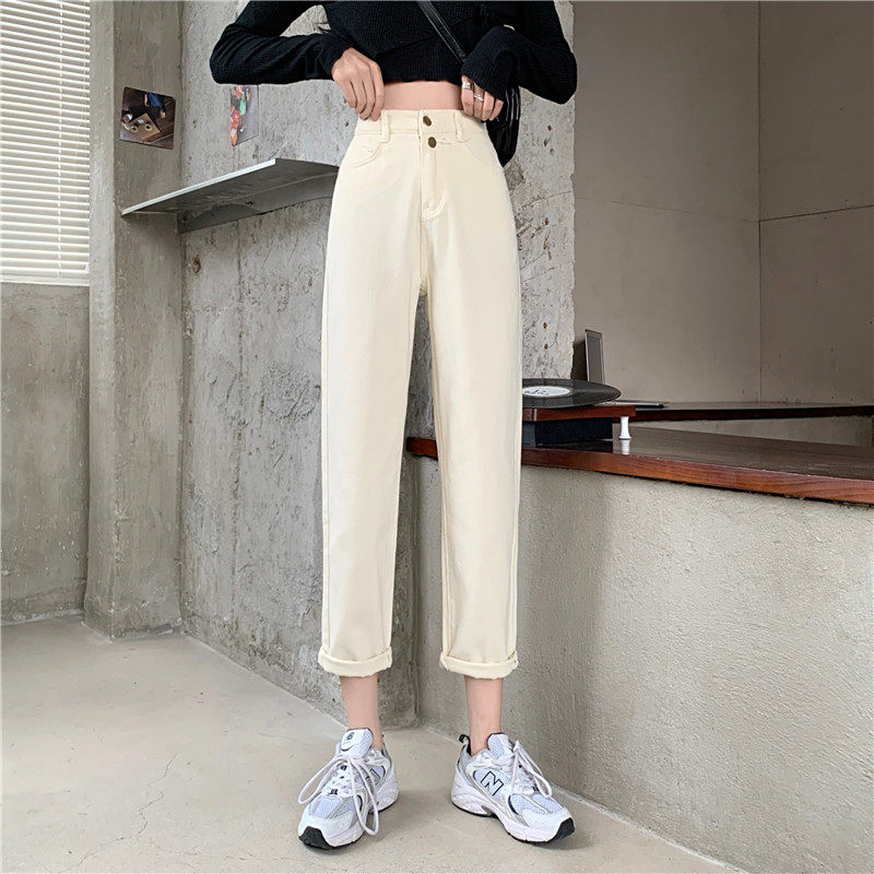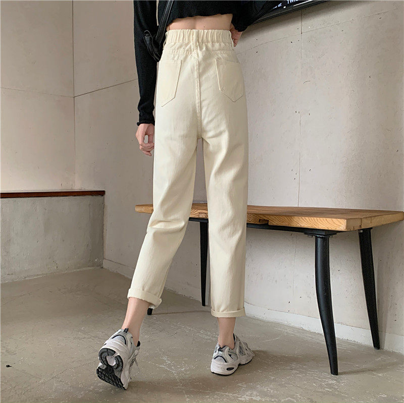 Бежевые осенние джинсы, штаны, эластичная талия, высокая талия, свободный прямой крой, оверсайз