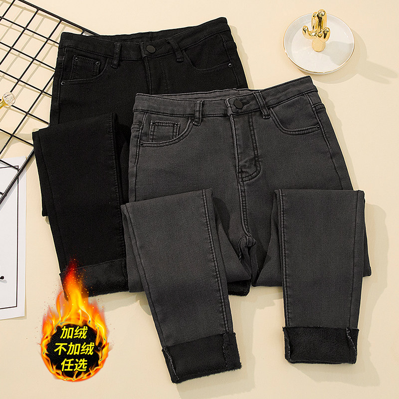 Весенние эластичные флисовые джинсы с начесом, черные штаны, коллекция 2021, в корейском стиле, высокая талия, увеличенная толщина