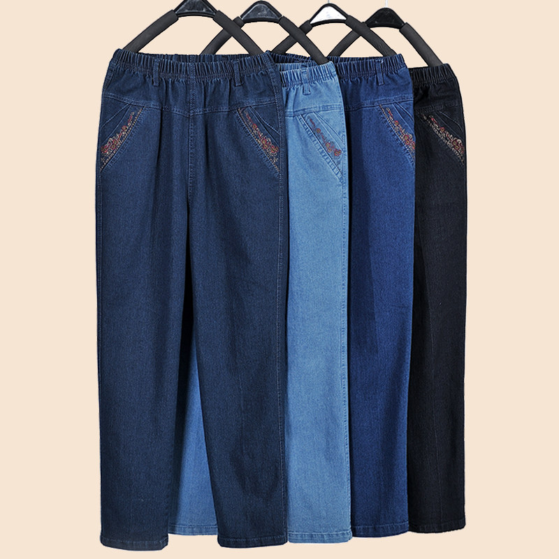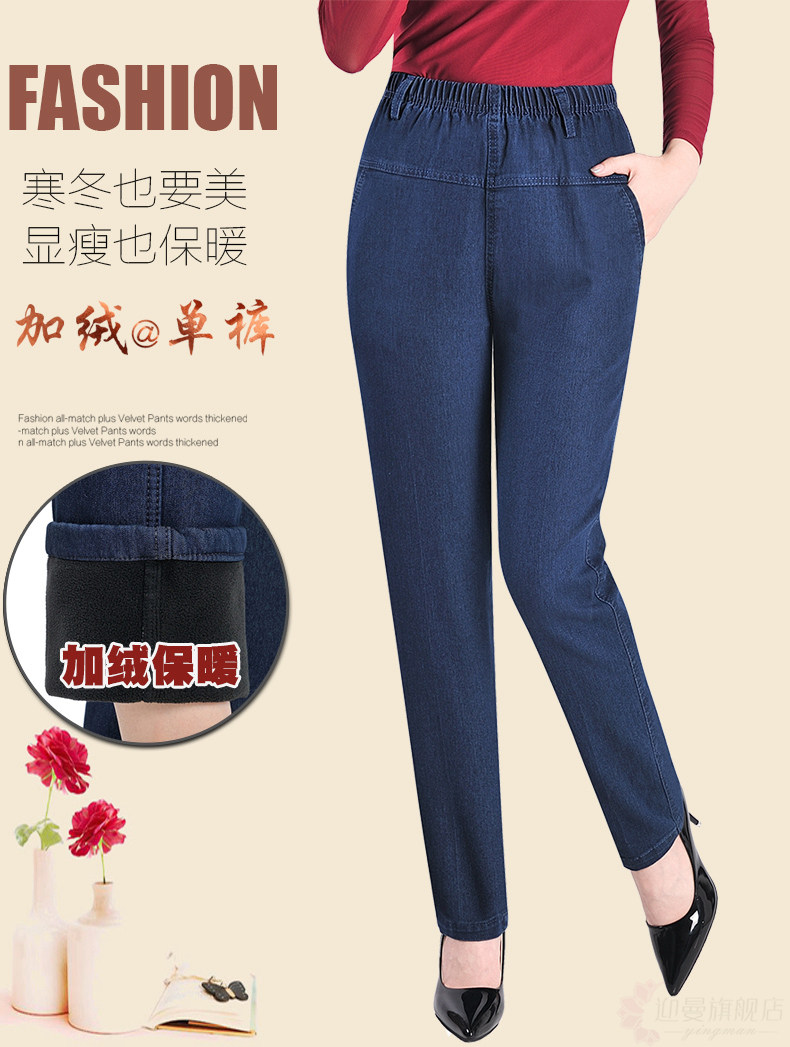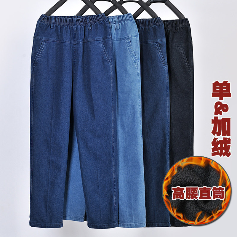 Утепленные джинсы, штаны, для среднего возраста, эластичная талия, увеличенная толщина, большой размер, свободный прямой крой