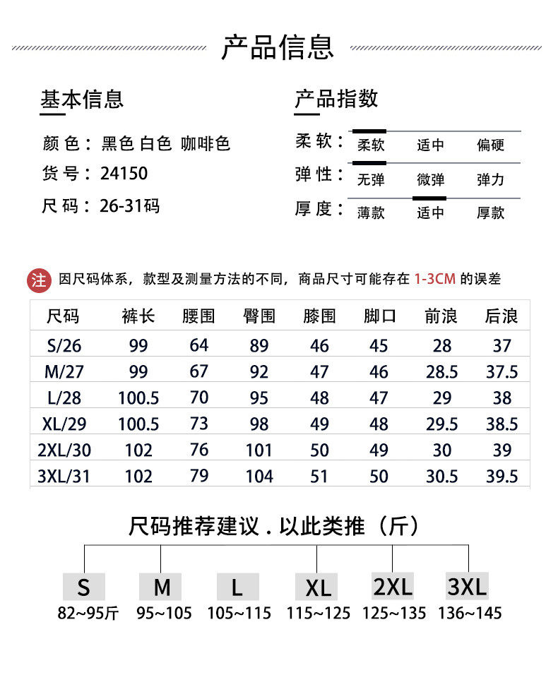 | Размер: | 26/с предложение 80-95 Catties, 27/м предложение 96-105 Catties, 28/L Рекомендуется 106-115 кот, 29/XL Предложение 116-125 Catties, 30/2xl Предложение 126-135 Catties, 31/3xl Предложение 136-150 кот |