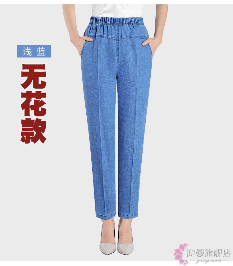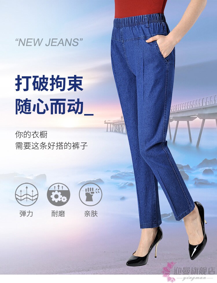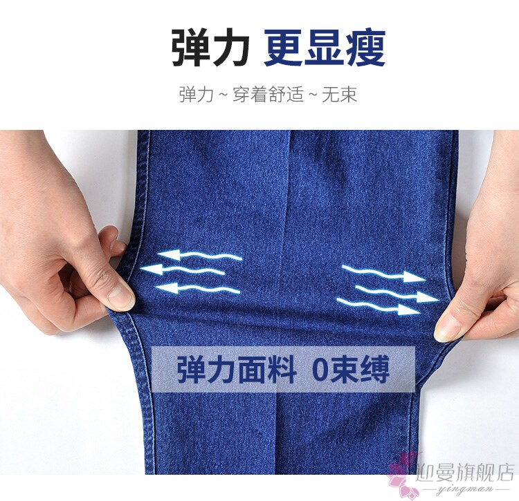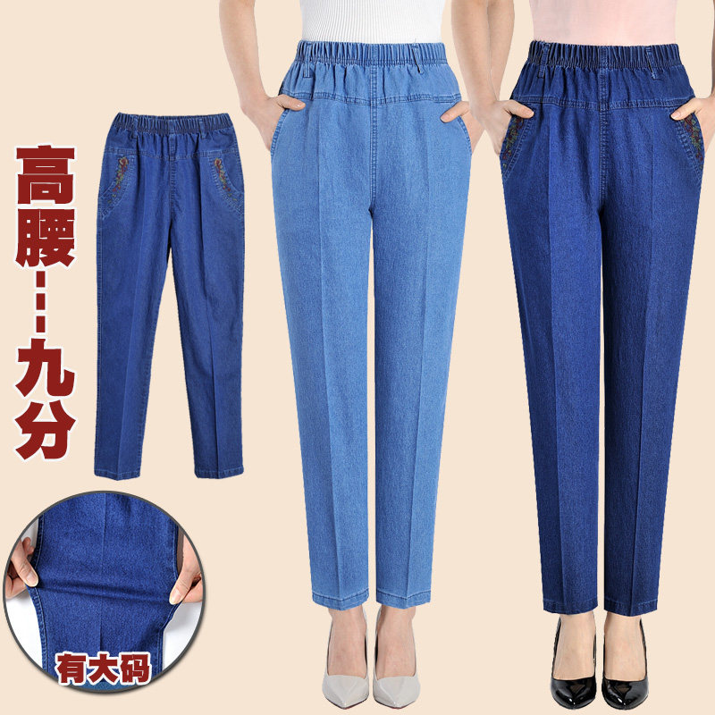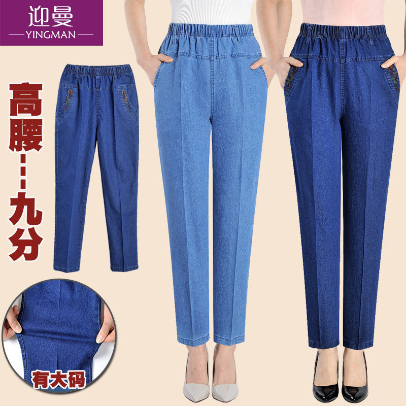 Весенние джинсы, эластичные штаны, для среднего возраста, большой размер, высокая талия