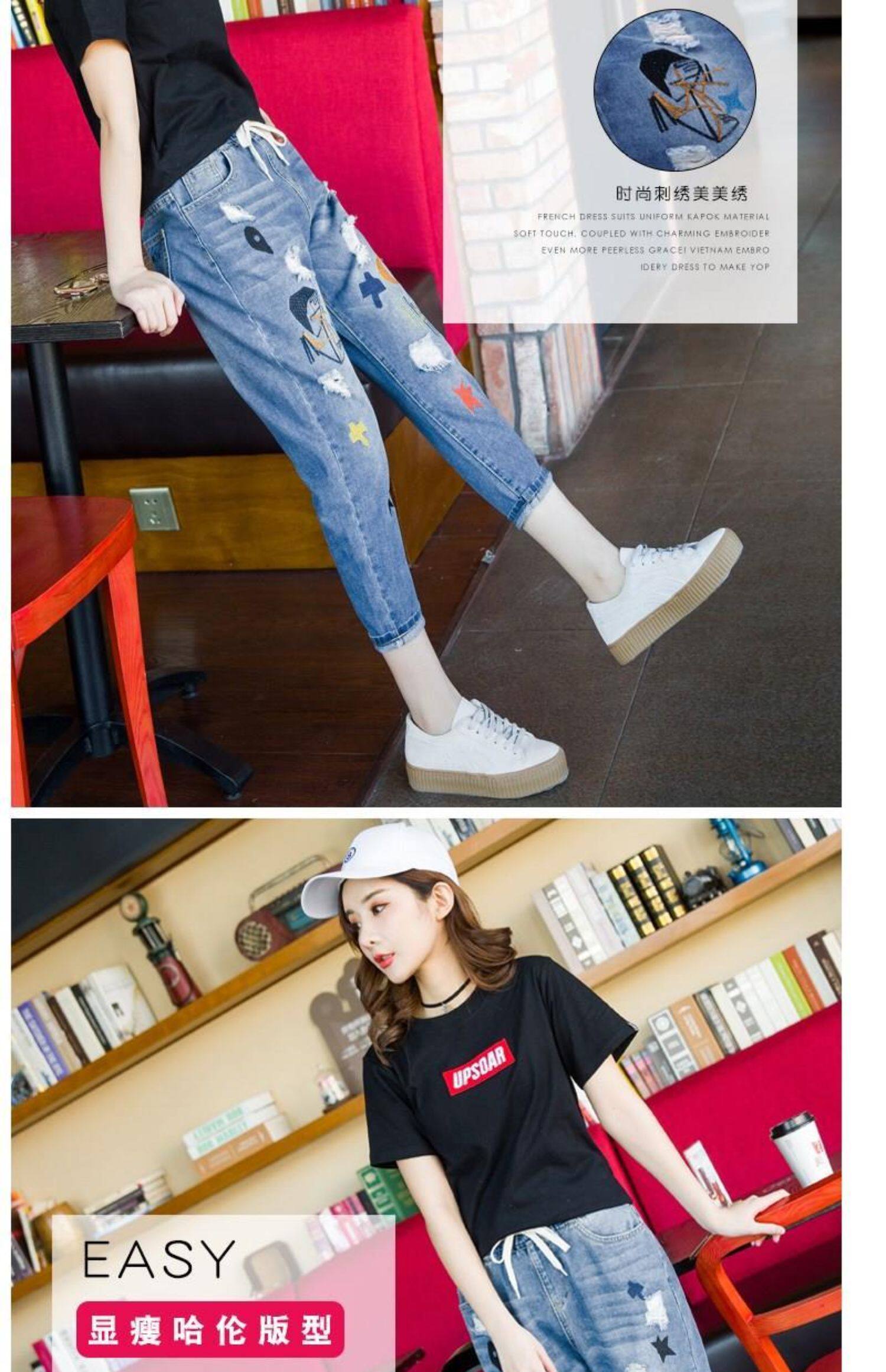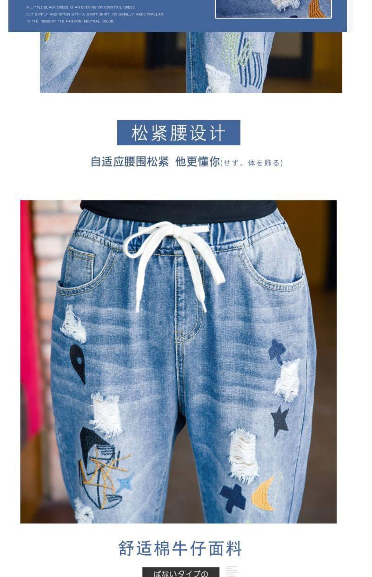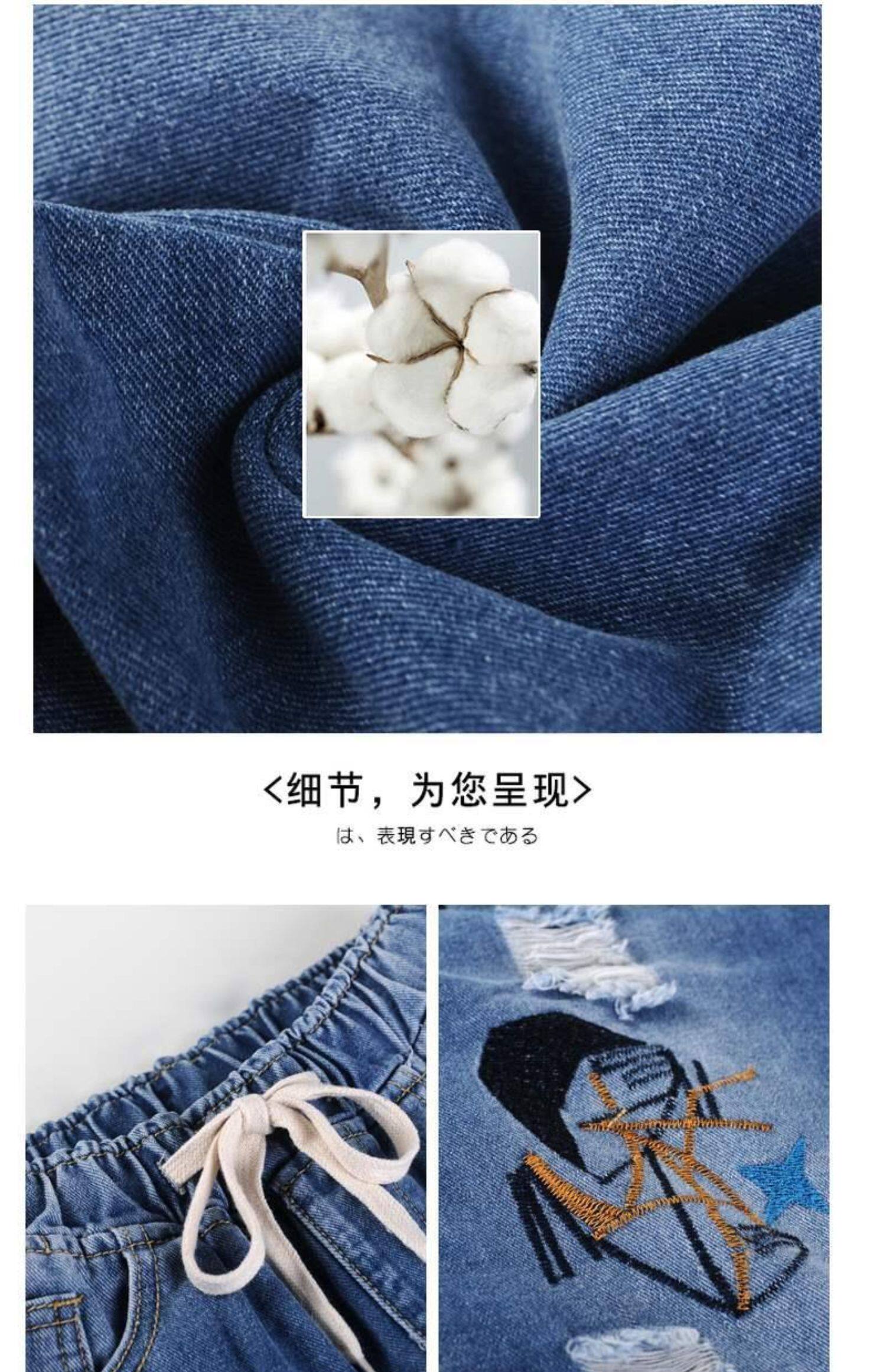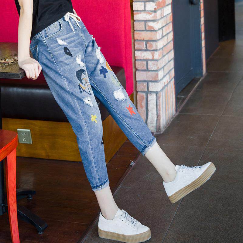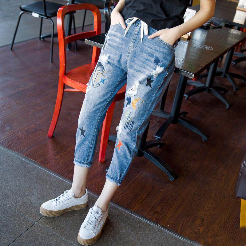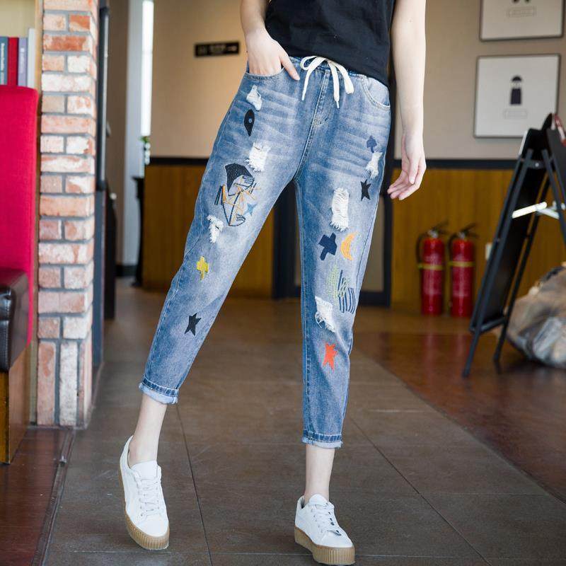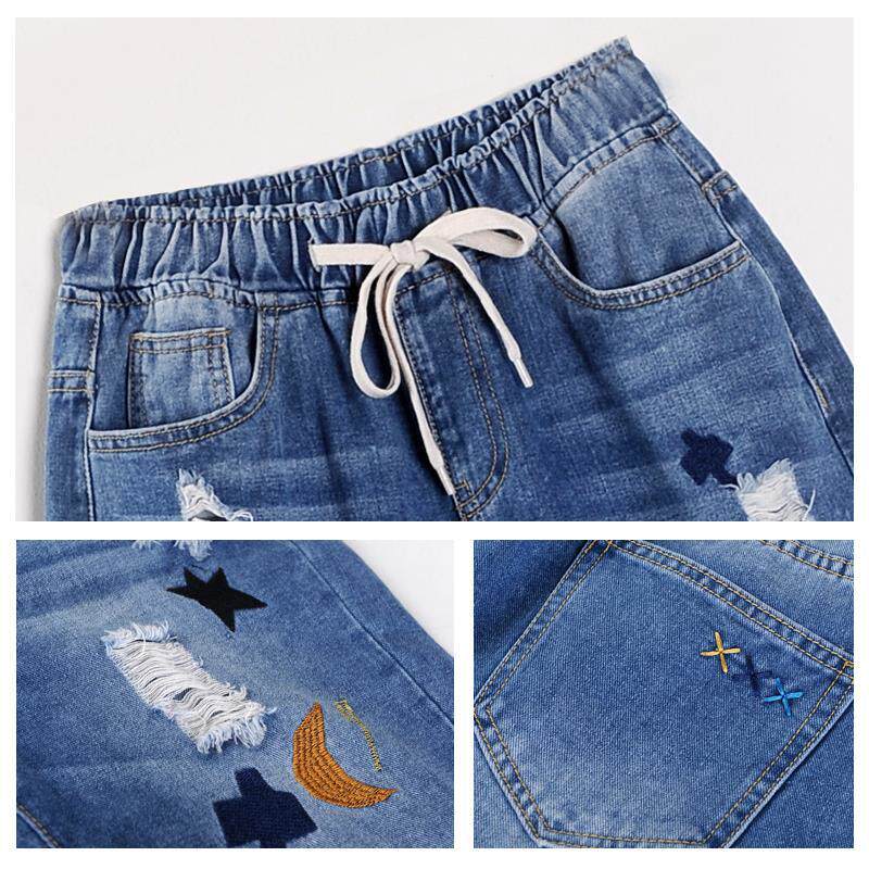 Джинсы, летние штаны, с вышивкой, эластичная талия, высокая талия, подходит для подростков