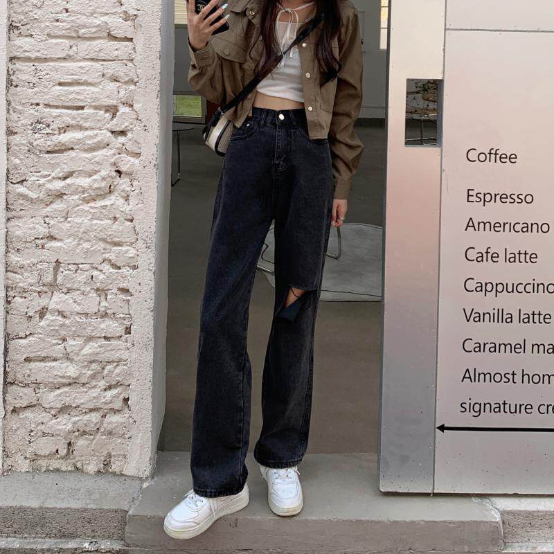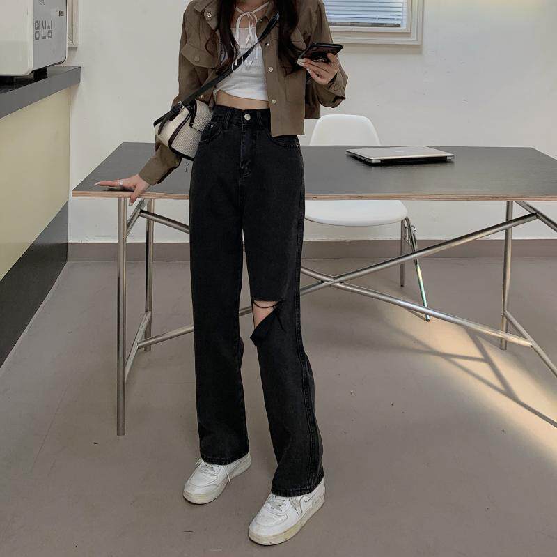 Осенние прямые свободные джинсы, приталенные ретро черные штаны, в корейском стиле, высокая талия