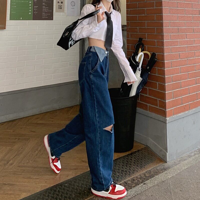Дизайнерские осенние джинсы, штаны, тренд сезона, коллекция 2021, городской стиль, высокая талия, свободный прямой крой