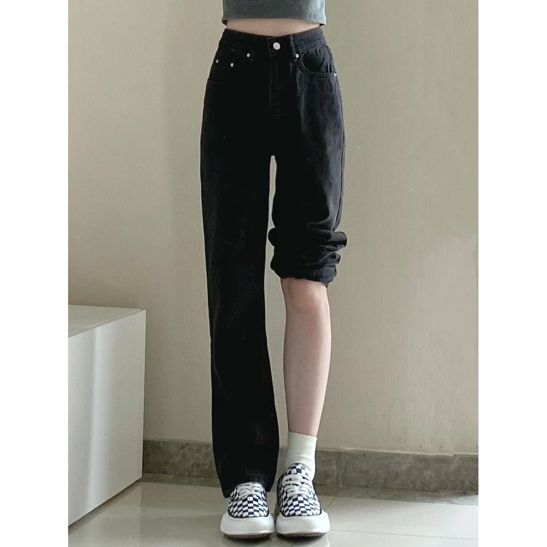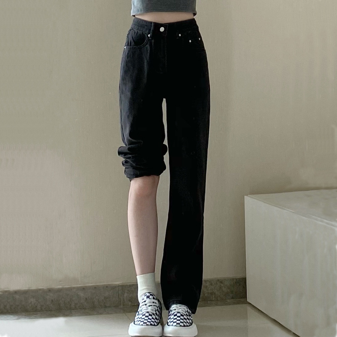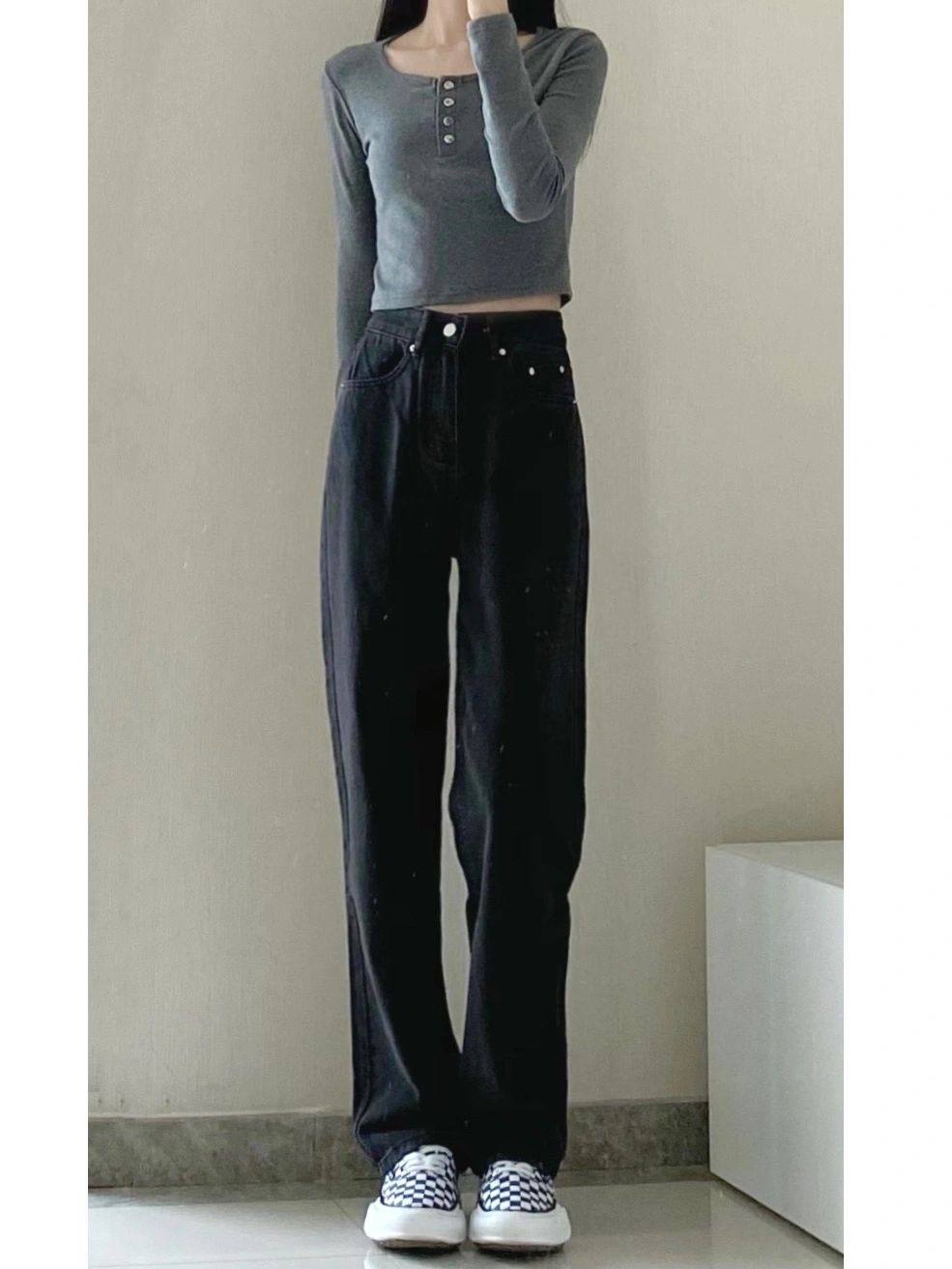 Черные весенние джинсы, летние приталенные штаны, свободный прямой крой, в корейском стиле, высокая талия