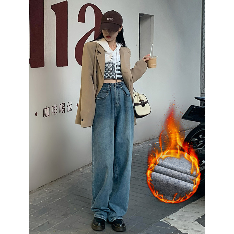 Утепленные ретро джинсы с начесом, синие штаны, 2021 года, свободный прямой крой